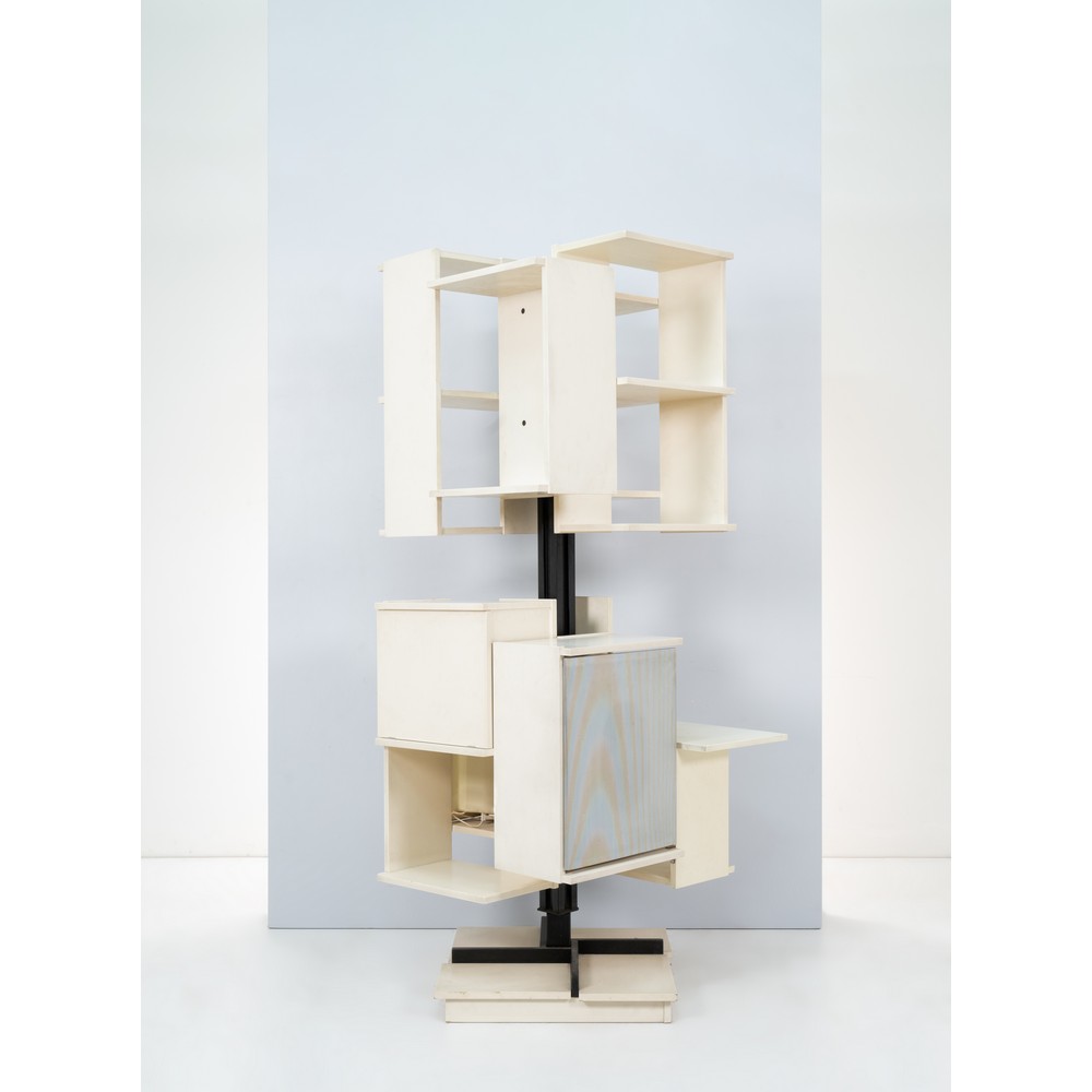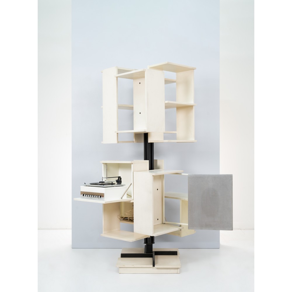 Libreria a libera installazione girevole modello "Centro", struttura in metallo verniciato nero, legno laccato bianco, materiale plastico. Rara versione speciale, con impianto stereo giradischi integrato.