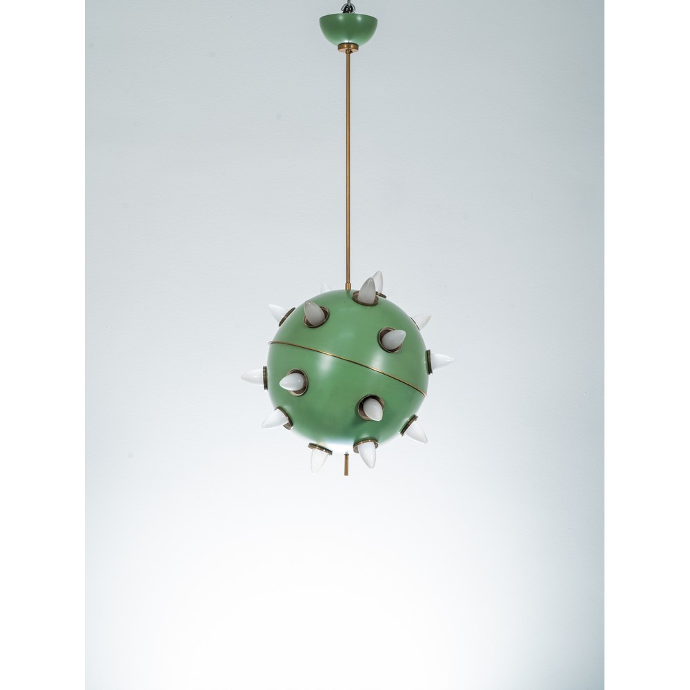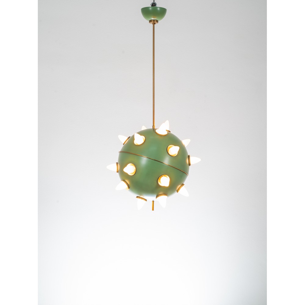 Lampada a sospensione modello “551” “Saturno” a venti luci, struttura in ottone con diffusore sferico in metallo laccato verde.
