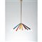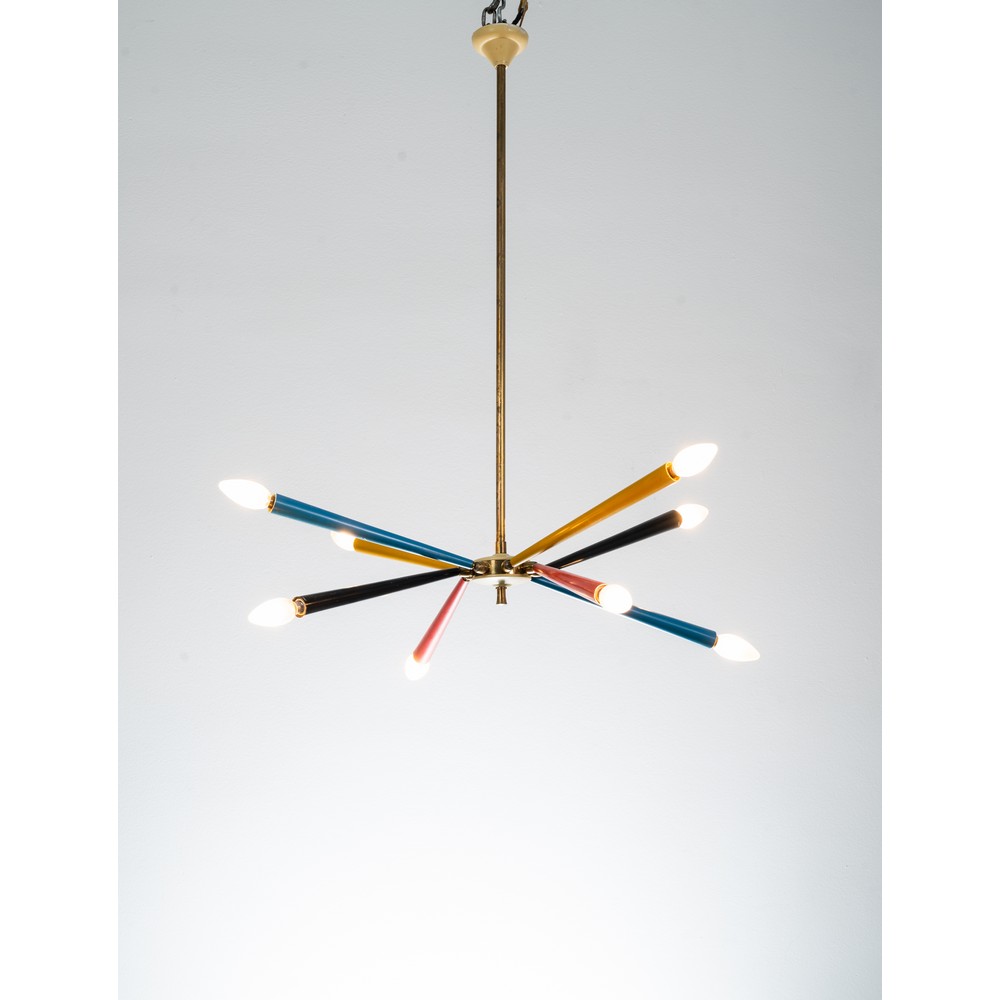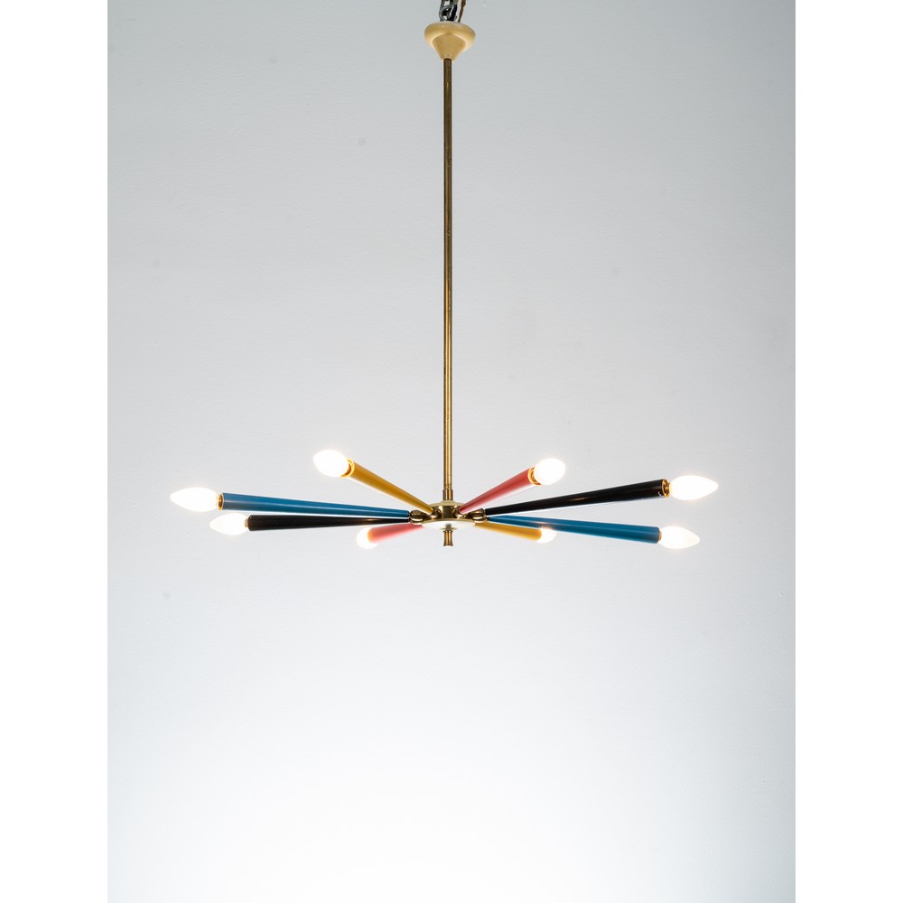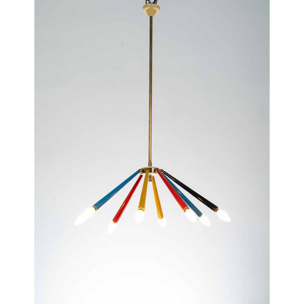 Lampada a sospensione a otto luci modello “Sputnik”, struttura in metallo dorato con bracci conici orientabili in metallo smaltato di colore differente, snodi in ottone.