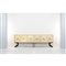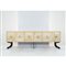 Sideboard con struttura in legno rivestito in pergamena, piano rettangolare, sul fronte tre vani chiusi con tre coppie di sportelli quadrati con ante a battente, maniglie in ottone, piedi sagomati in legno verniciato nero. Segni di uso al piano.