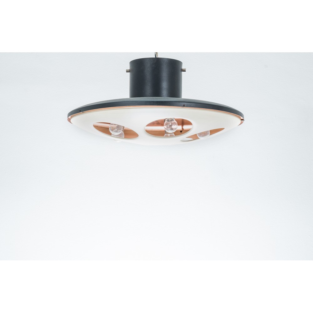 Lampada a soffitto a cinque luci modello “1243”, diffusore a disco con fortune in rame spazzolato, alluminio verniciato avorio, ottone. Etichetta di produzione.