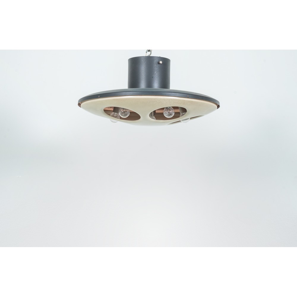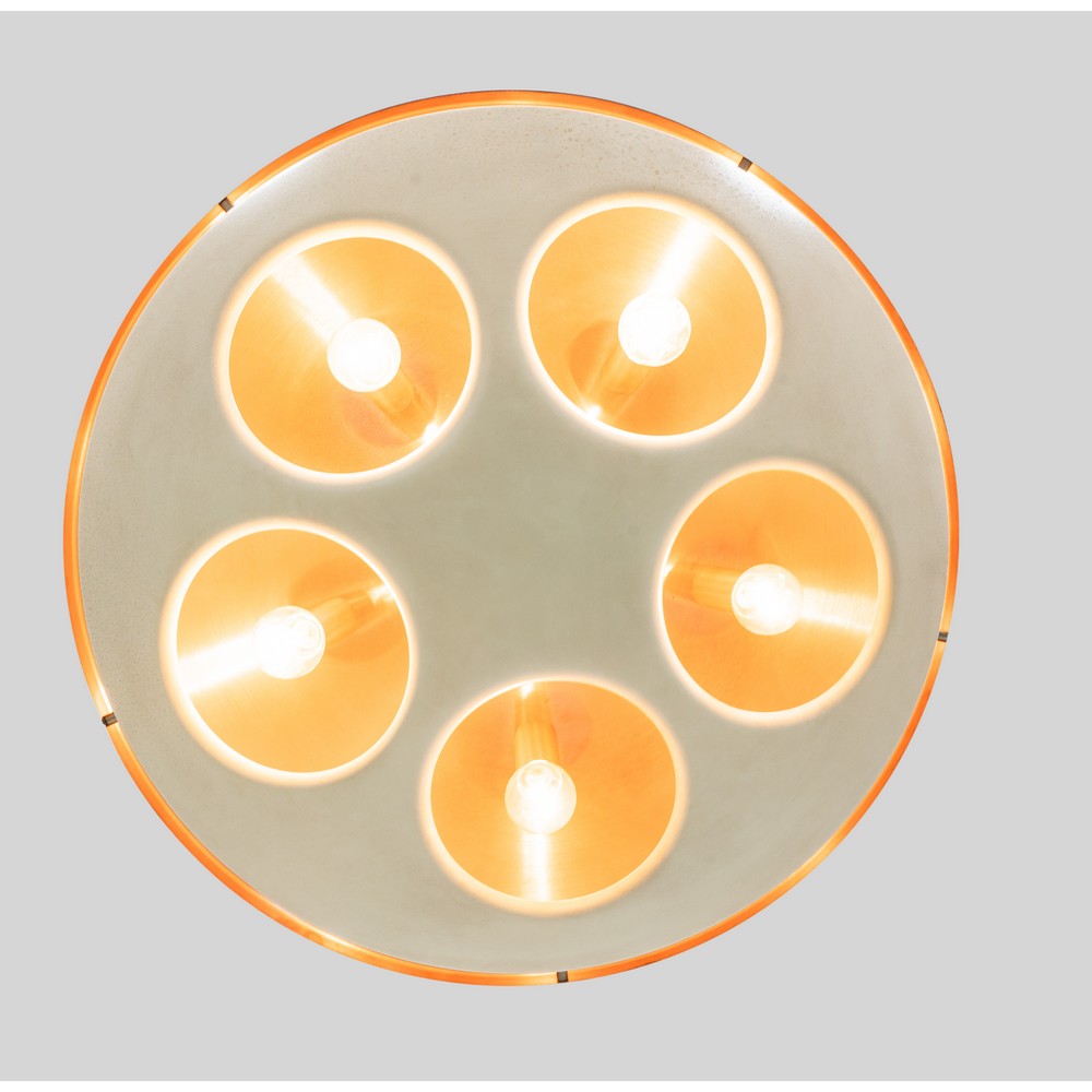Lampada a soffitto a cinque luci modello “1243”, diffusore a disco con fortune in rame spazzolato, alluminio verniciato avorio, ottone. Etichetta di produzione.