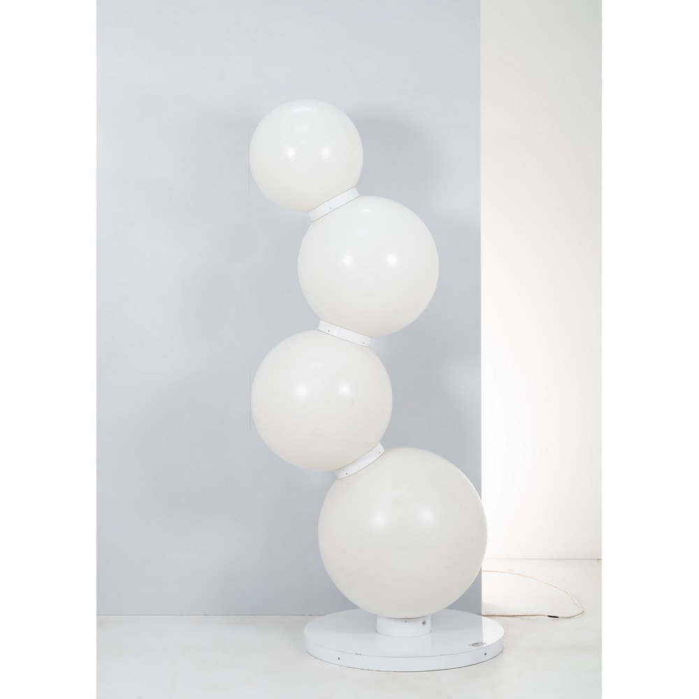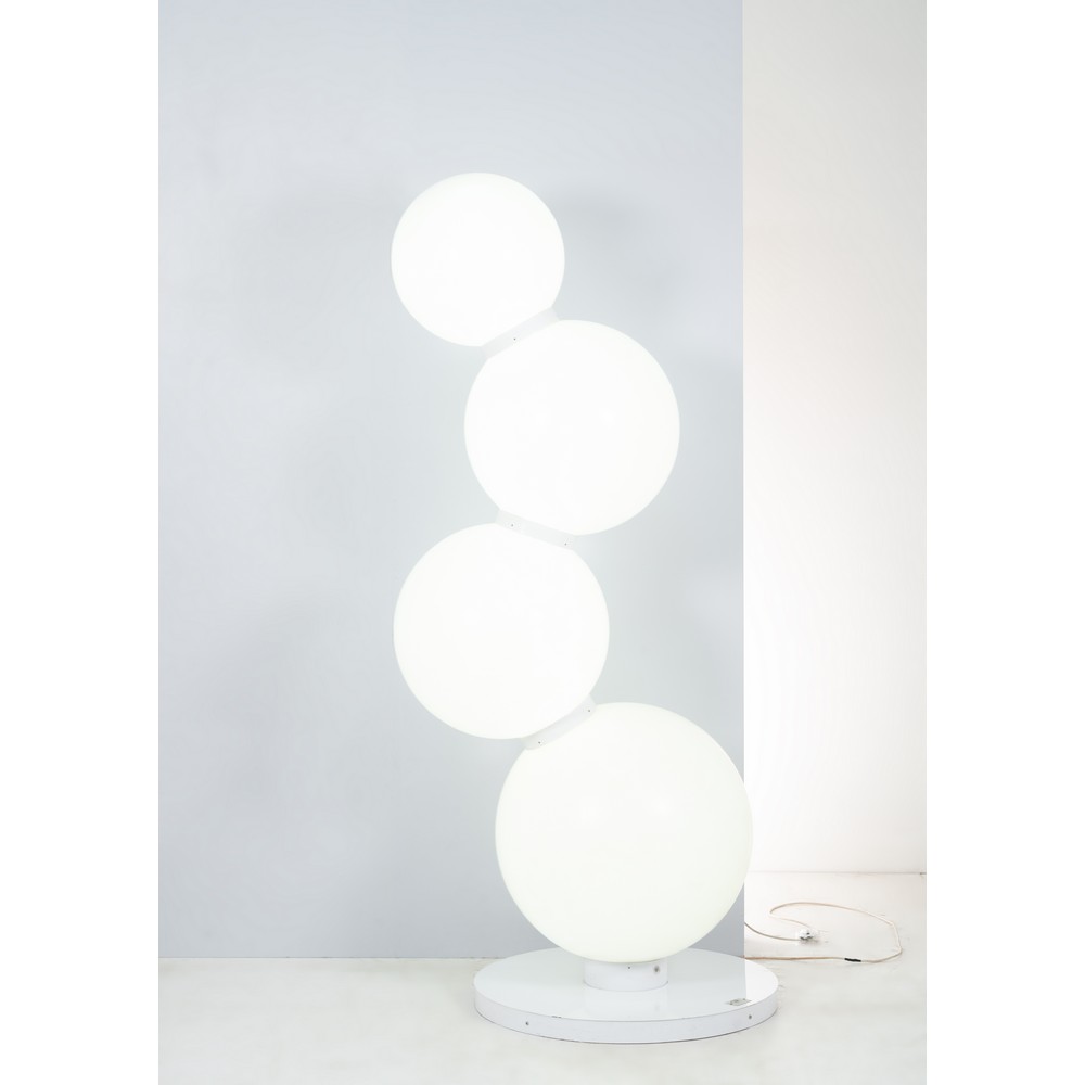 Lampada da terra a quattro luci modello “BubbleTree”, diffusore composto da quattro sfere in ABS, base circolare e giunti in metallo verniciato bianco. Etichetta di produzione e numerazione.
