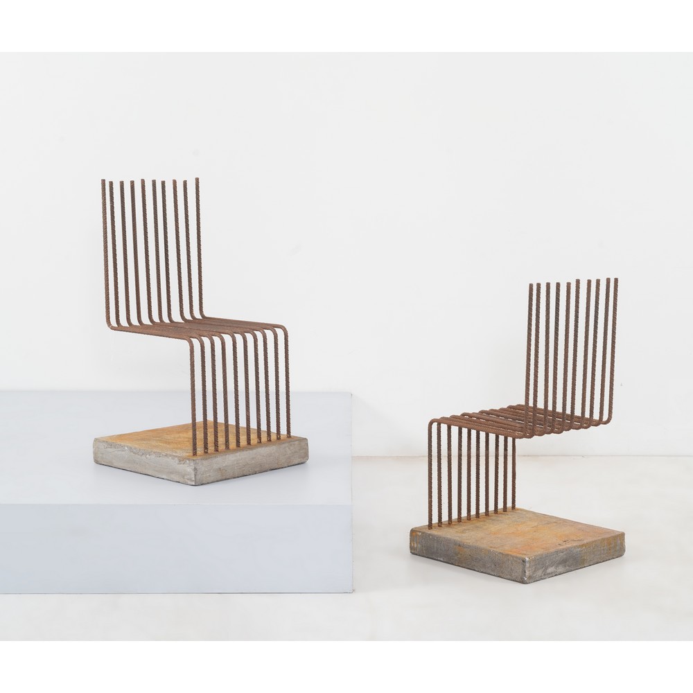 Due sedie modello “Solid Cemento”, struttura in tondino in ferro curvato, base in cemento armato.