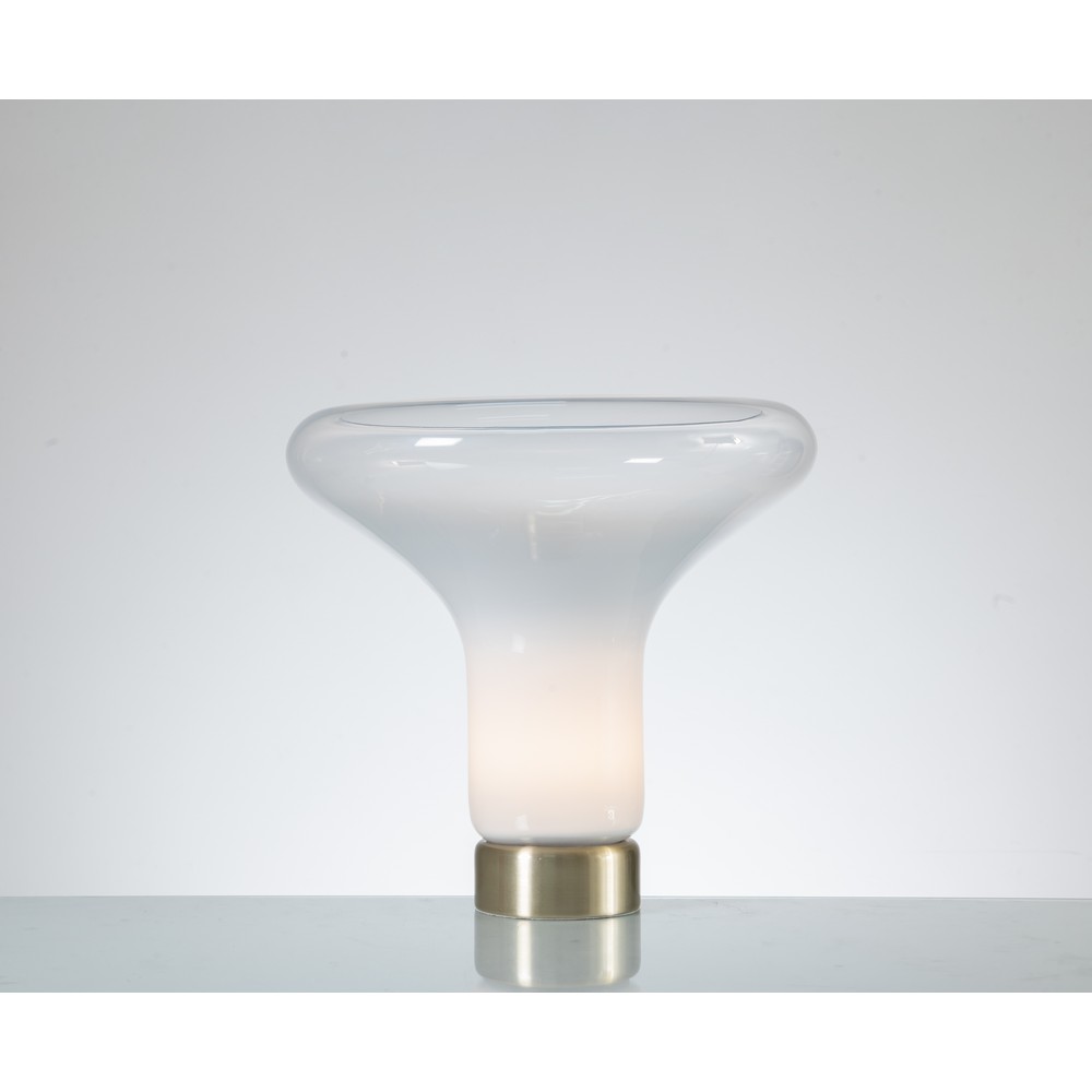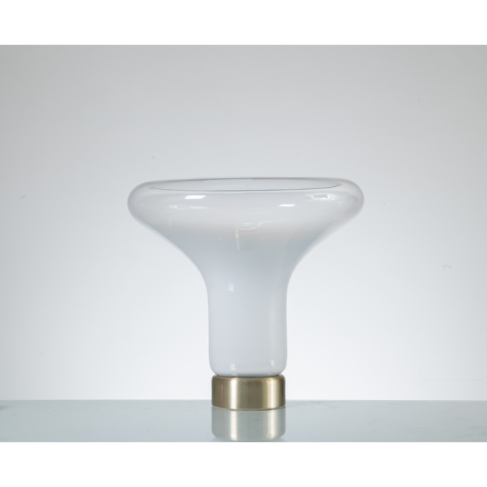 Lampada da tavolo ad una luce con diffusore in vetro lattimo di Murano (produzione Vistosi), base circolare in alluminio spazzolato.