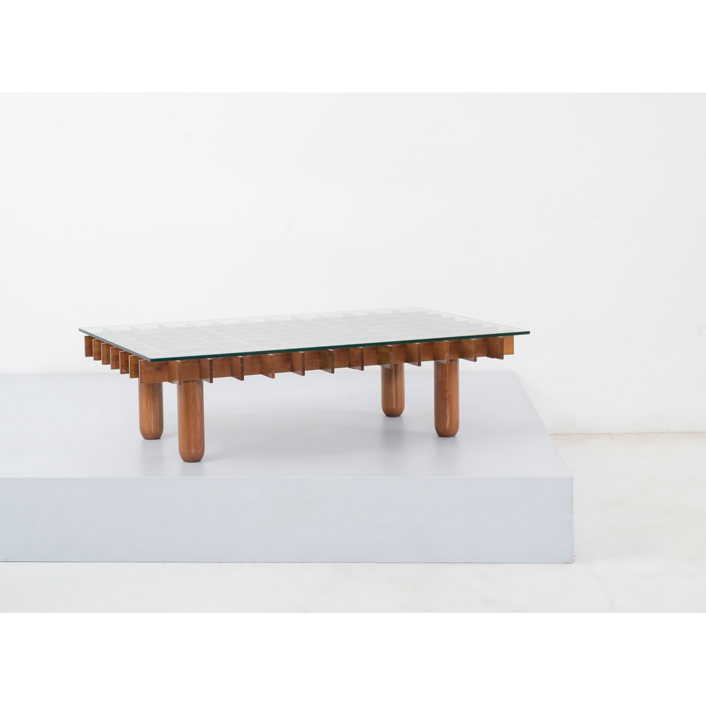 Tavolo da salotto modello “Kyoto” con struttura in legno tornito, listelli di legno uniti ad incastro, piano rettangolare in cristallo molato.