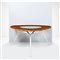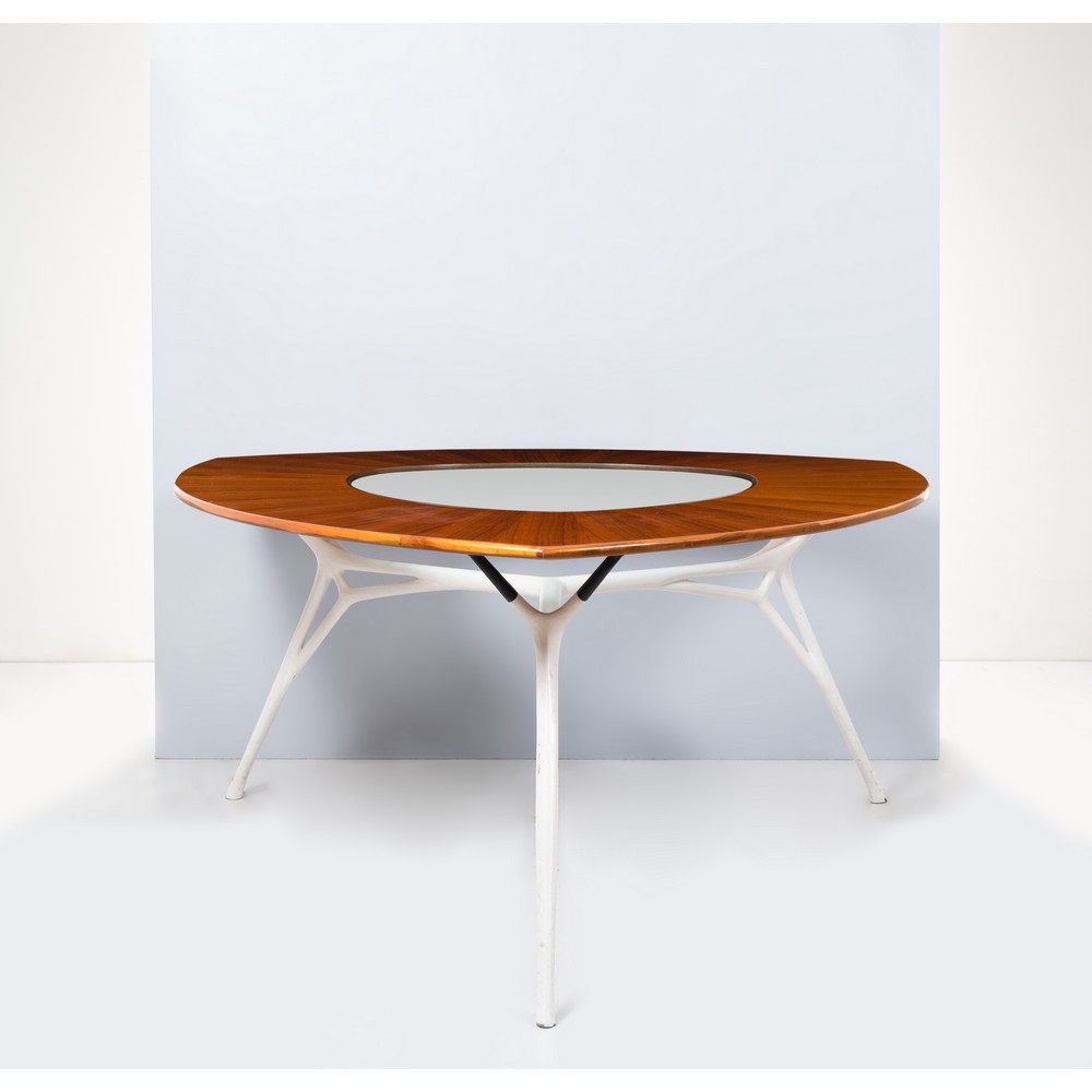Tavolo da pranzo con struttura in metallo verniciato con piano triangolare in noce e cristallo. Firma e data presente.