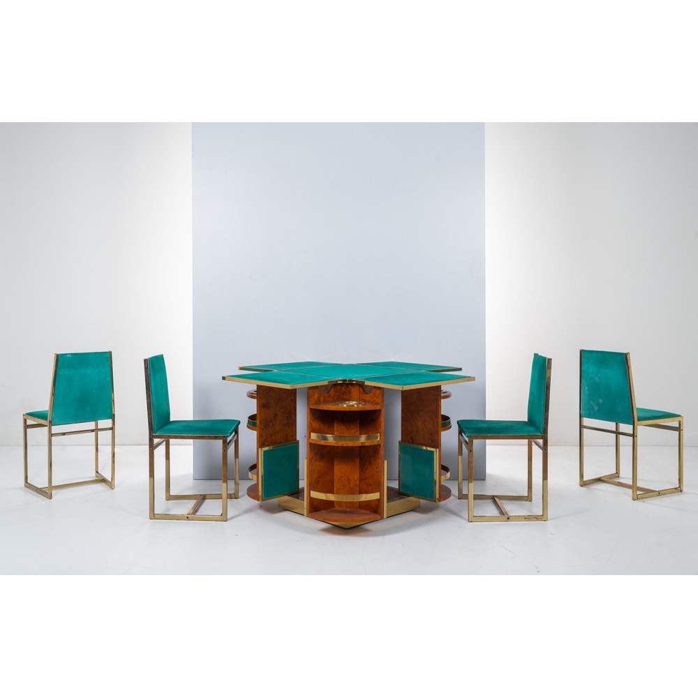Tavolo da gioco apribile modello “Cubo” con struttura in ottone lucido, legno, panno verde e firma incussa dell'Autore. Quattro sedie con struttura in ottone, spalliera e seduta con imbottitura e rivestimento in panno verde.
