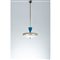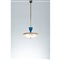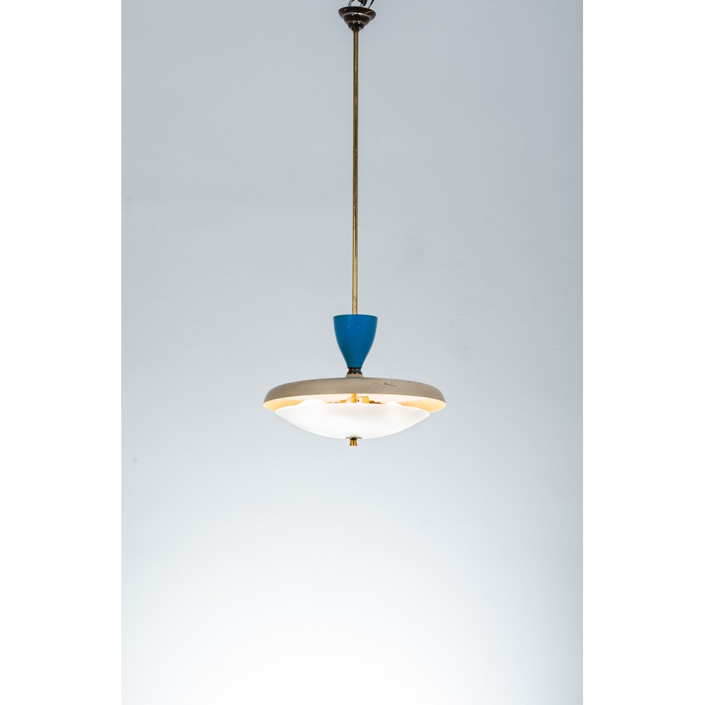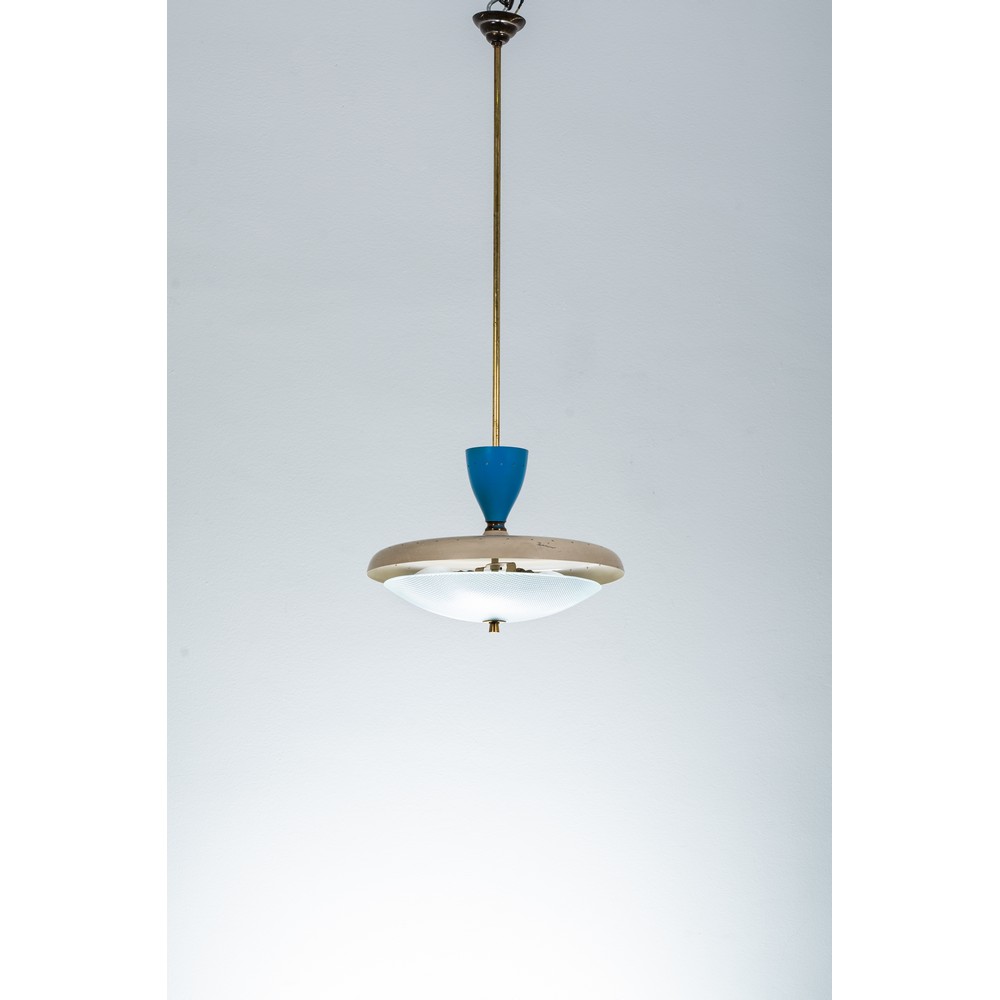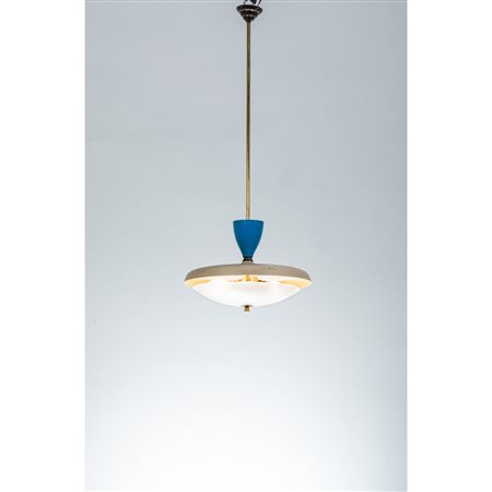 Lampada a sospensione a due luci, diffusore circolare in metallo verniciato avorio e blu, disco in vetro a stampo, minuterie in ottone. Segni di uso.