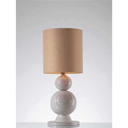 Lampada da tavolo ad una luce modello “Siviglia” in ceramica smaltata bianca, corpo composto da due sfere sovrapposte e decorate con motivi geometrici incisi, base circolare, diffusore in tessuto avorio.