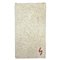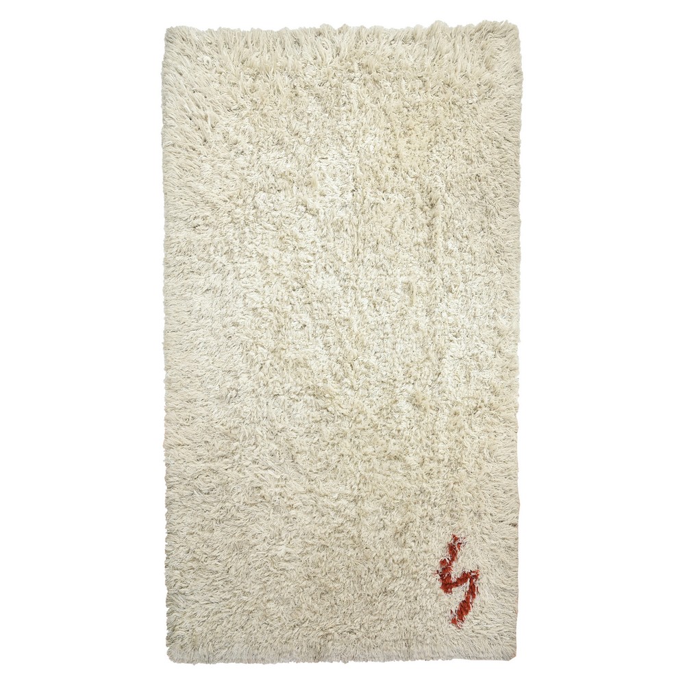 Tappeto rettangolare con tessitura a telaio color bianco, decoro rosso informe laterale. Etichetta di produzione.