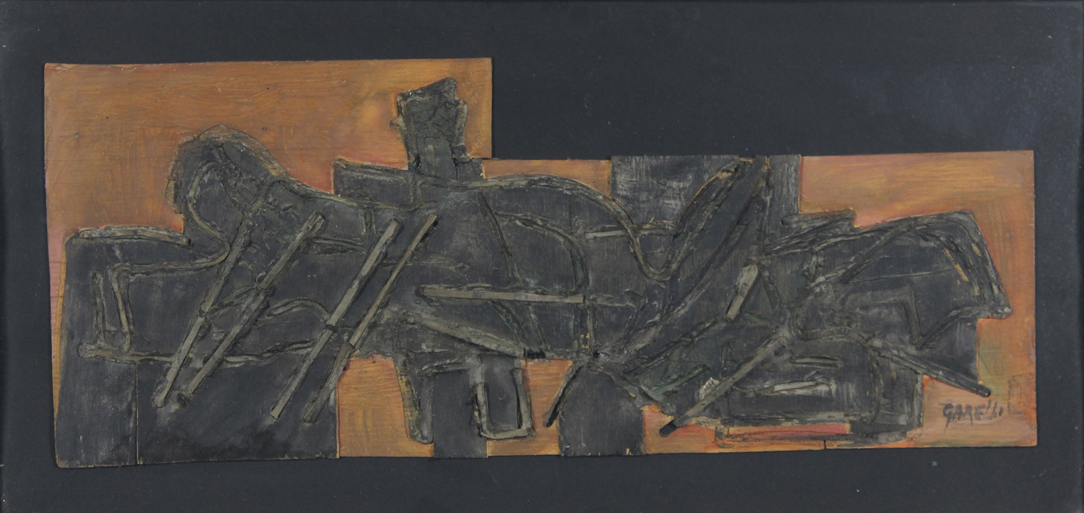 Garelli Franco Senza titolo, fine anni '50 bassorilievo in legno e materiali vari, cm. 26x64,5 firmato in basso a destra, certificato di autenticità della Casa d'Aste Sant'Agostino su fotografia