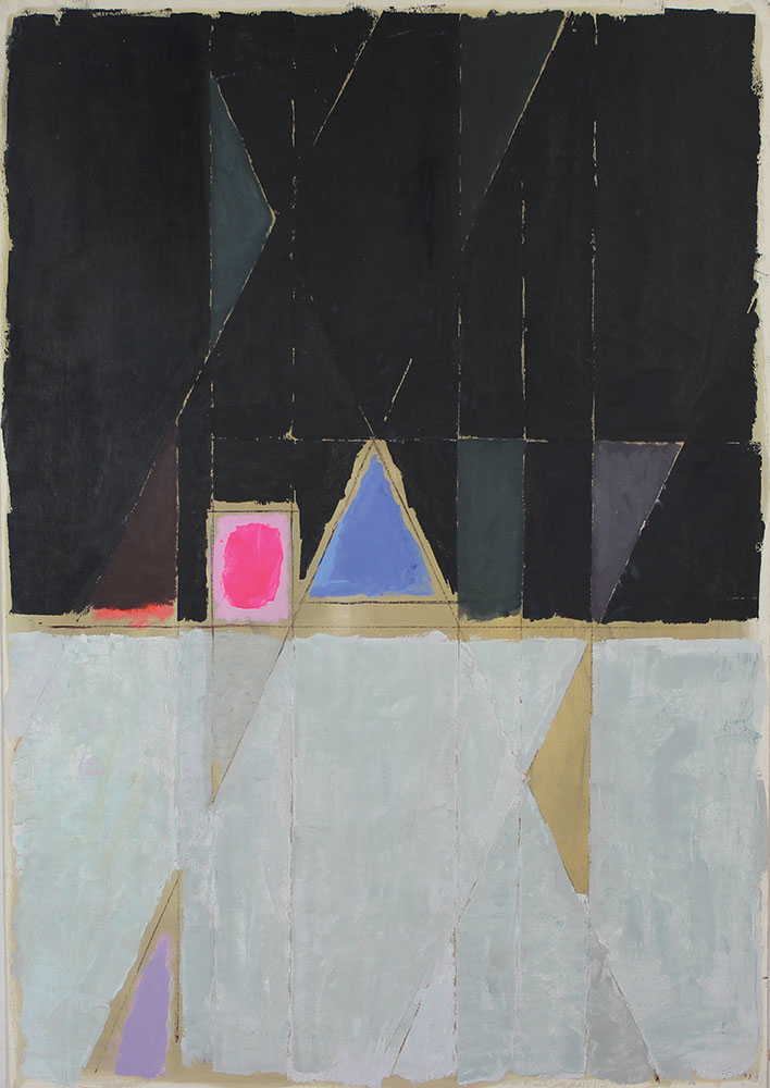 Finzi Ennio Composizione, 1993 tecnica mista su cartoncino applicato su tela, cm. 100x70 firmato e datato in basso a destra, fotografia dell'opera con timbro della Galleria Multigraphic Luciano De March senza cornice
