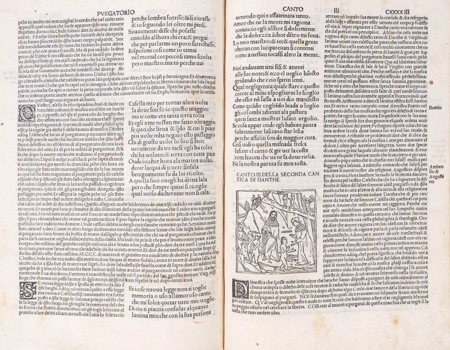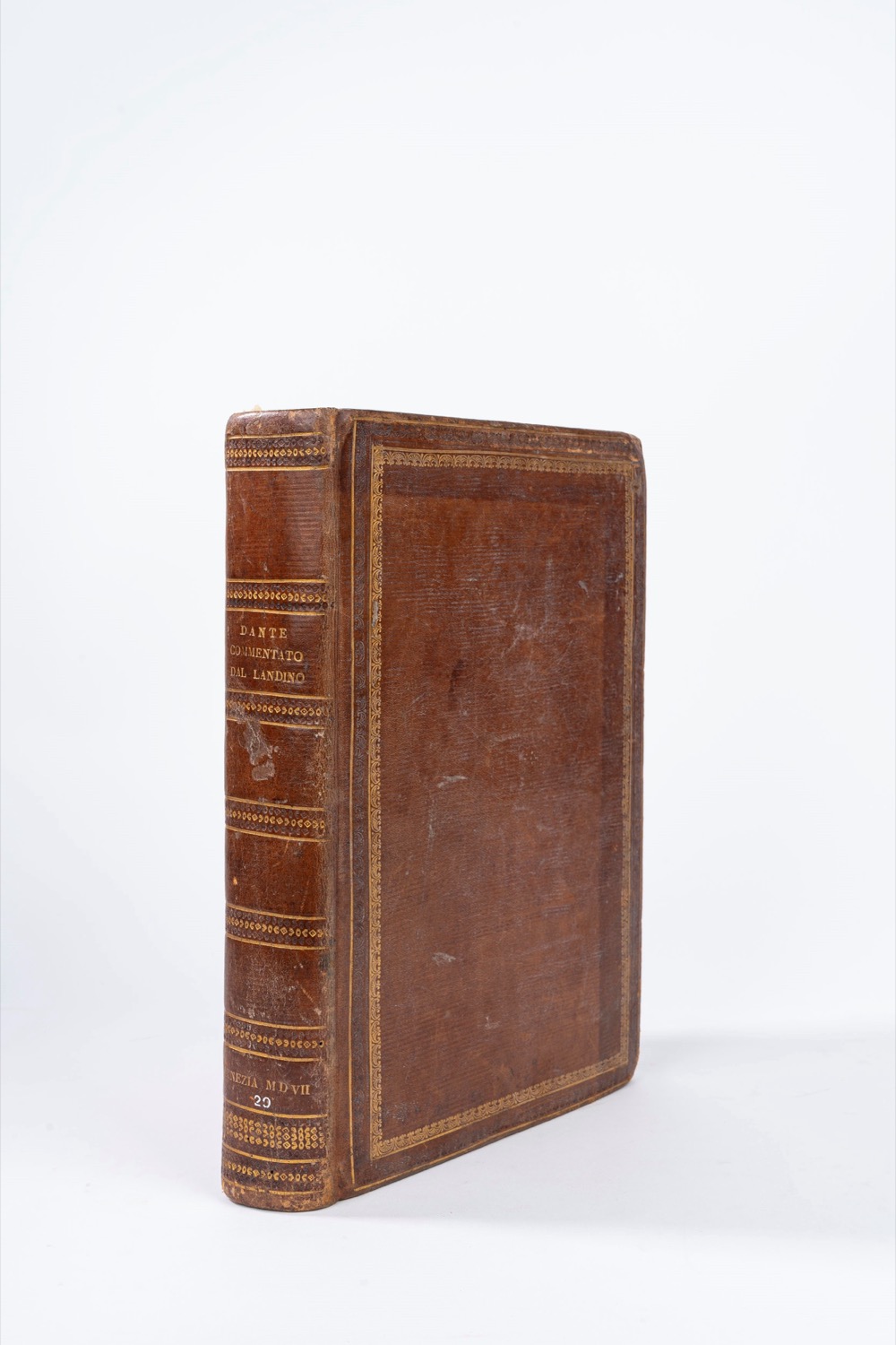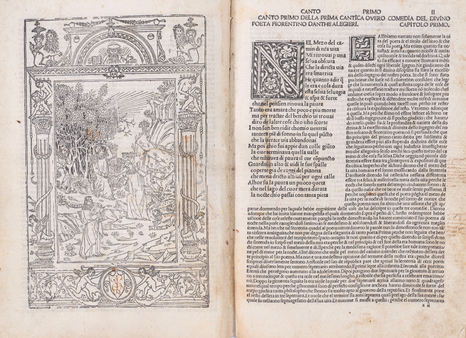 Venezia, per Bartholomeo de Zanni da Portese, 1507 adi XVII de zugno. In 2°. Superbamente illustrato con una splendida xilografia a piena pagina entro una bordura istoriata in apertura dell'Inferno e 99 xilografie più piccole nel testo, attribuite al Maestro del Pico Plinio, numerose iniziali xilografiche in bianco e nero di varie dimensioni, prima carta facsimilata, le seguenti 5 coi margini rifatti, marginali bruniture, legatura del sec.XIX con piatti decorati in oro, sciupata. Postillato.Venezia, per Bartholomeo de Zanni da Portese, 1507 adi XVII de zugno. In 2°. Superbamente illustrato con una splendida xilografia a piena pagina entro una bordura istoriata in apertura dell'Inferno e 99 xilografie più piccole nel testo, attribuite al Maestro del Pico Plinio, numerose iniziali xilografiche in bianco e nero di varie dimensioni, prima carta facsimilata, le seguenti 5 coi margini rifatti, marginali bruniture, legatura del sec.XIX con piatti decorati in oro, sciupata. Postillato.