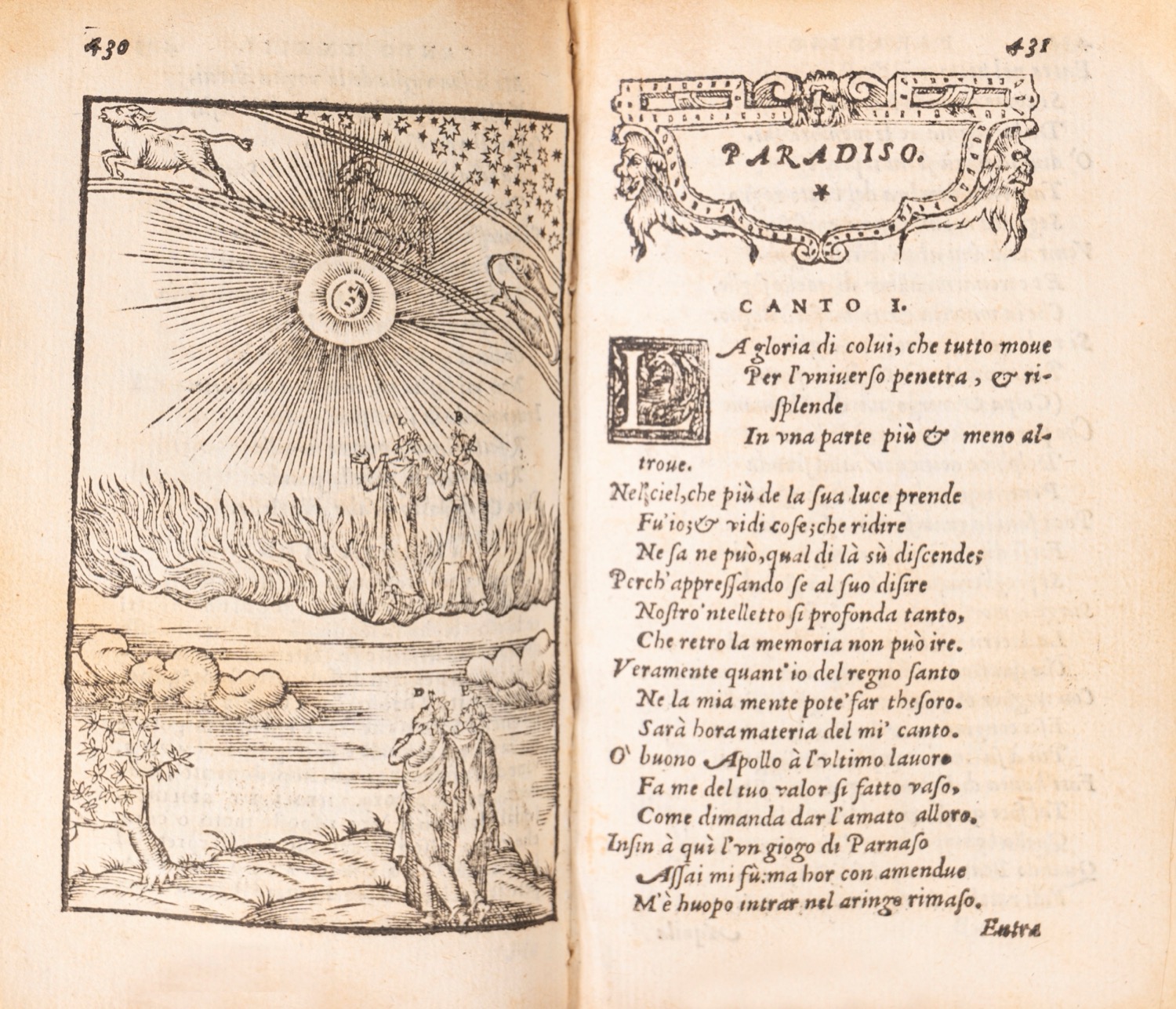 Lione, appresso Guglielmo Rovillo, 1575. In 8°. Legatura in piena pergamena. Dorso liscio con autore e anno manoscritti in inchiostro bruno. Marca tipografica al frontespizio. Medaglione con ritratto di Dante a c. A3v. 3 illustrazioni incise in legno a piena pagina nel testo. Capilettera e cartouches xilografiche in principio delle Cantiche. Strappi, tarli e bruniture. Lione, appresso Guglielmo Rovillo, 1575. In 8°. Legatura in piena pergamena. Dorso liscio con autore e anno manoscritti in inchiostro bruno. Marca tipografica al frontespizio. Medaglione con ritratto di Dante a c. A3v. 3 illustrazioni incise in legno a piena pagina nel testo. Capilettera e cartouches xilografiche in principio delle Cantiche. Strappi, tarli e bruniture.