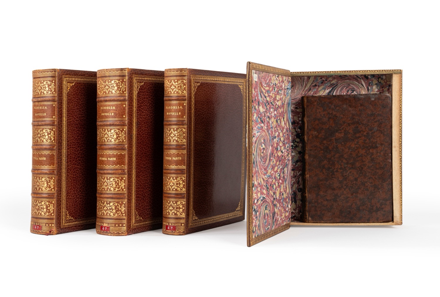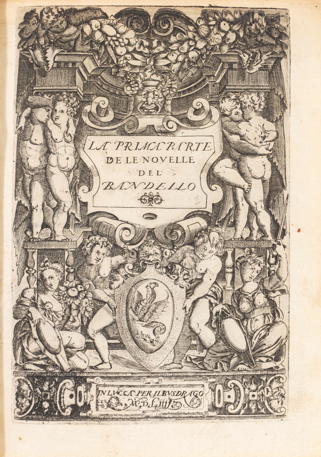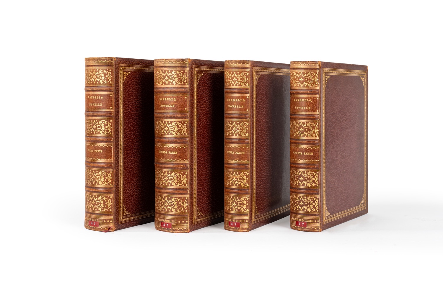 Lucca, Busdrago, 1544. In 4°. 4 voll. Le prime tre parti, con frontespizi finemente decorati, stampate tutte a Lucca nel 1544; la quarta parte a Lione appresso Alessandro Marsilii [stampato da Pietro Roussino], 1573. Questa IV parte si presenta in formato 8° con legatura del sec.XVIII in vitello spugnato, tagli a spruzzo policromi. Il frontespizio e le prime due carte della Seconda parte con restauri al margine superiore, per il resto STUPENDO ESEMPLARE in una LEGATURA DA AMATORE in marocchino rosso a grana lunga con decorazioni in oro ai piatti e al dorso, firmata Rudolph Schmid di Berlino; il IV volume entro box con la medesima legatura. Lucca, Busdrago, 1544. In 4°. 4 voll. Le prime tre parti, con frontespizi finemente decorati, stampate tutte a Lucca nel 1544; la quarta parte a Lione appresso Alessandro Marsilii [stampato da Pietro Roussino], 1573. Questa IV parte si presenta in formato 8° con legatura del sec.XVIII in vitello spugnato, tagli a spruzzo policromi. Il frontespizio e le prime due carte della Seconda parte con restauri al margine superiore, per il resto STUPENDO ESEMPLARE in una LEGATURA DA AMATORE in marocchino rosso a grana lunga con decorazioni in oro ai piatti e al dorso, firmata Rudolph Schmid di Berlino; il IV volume entro box con la medesima legatura.