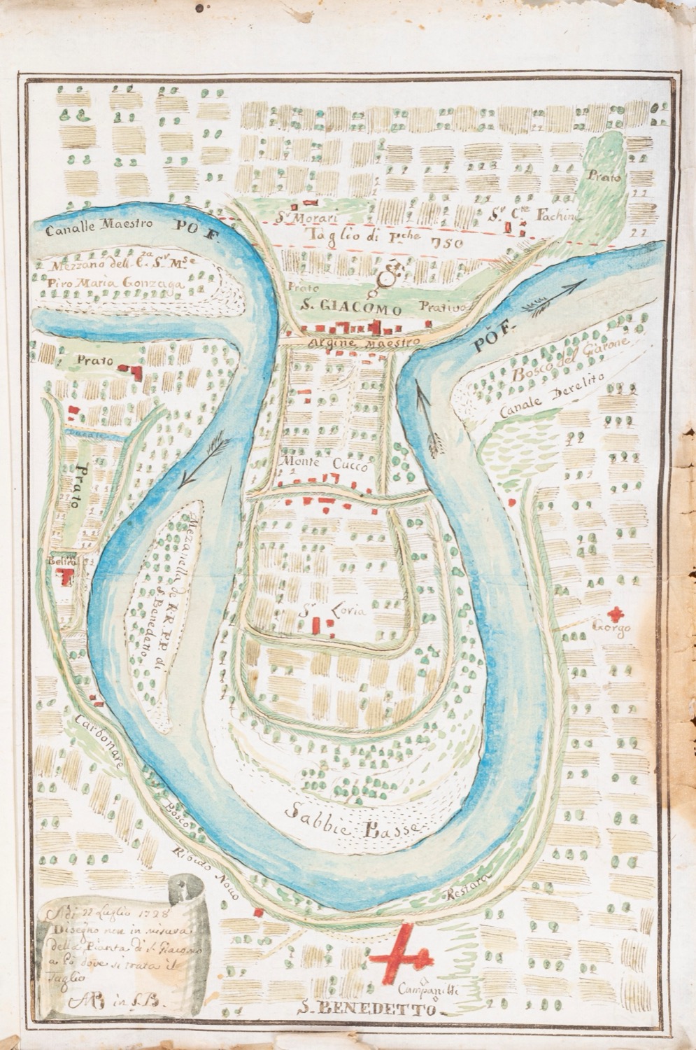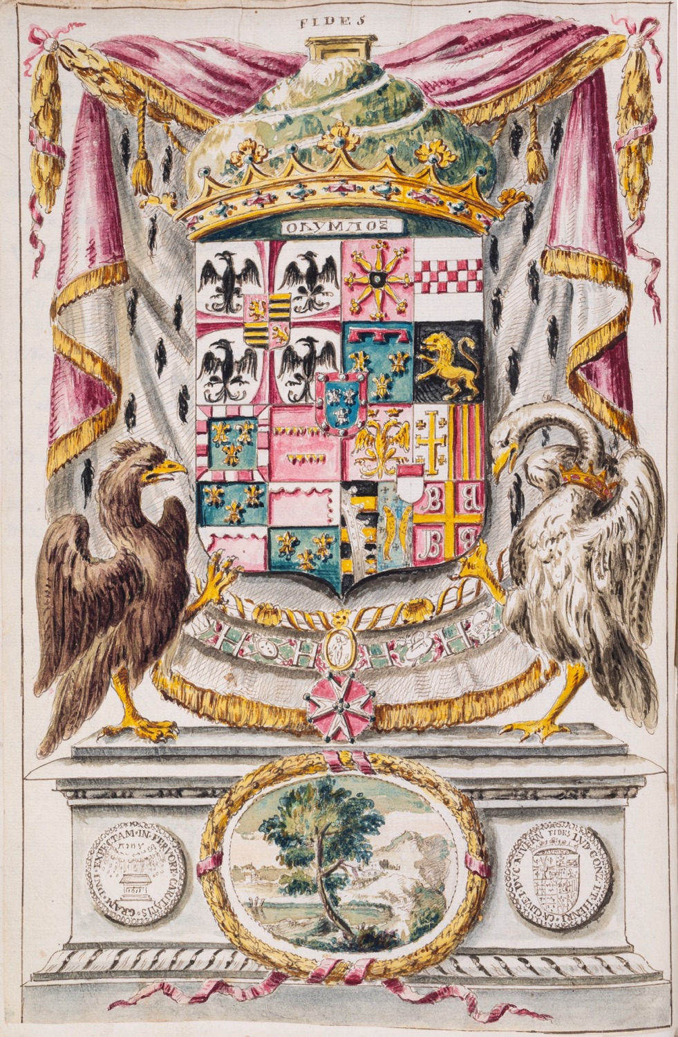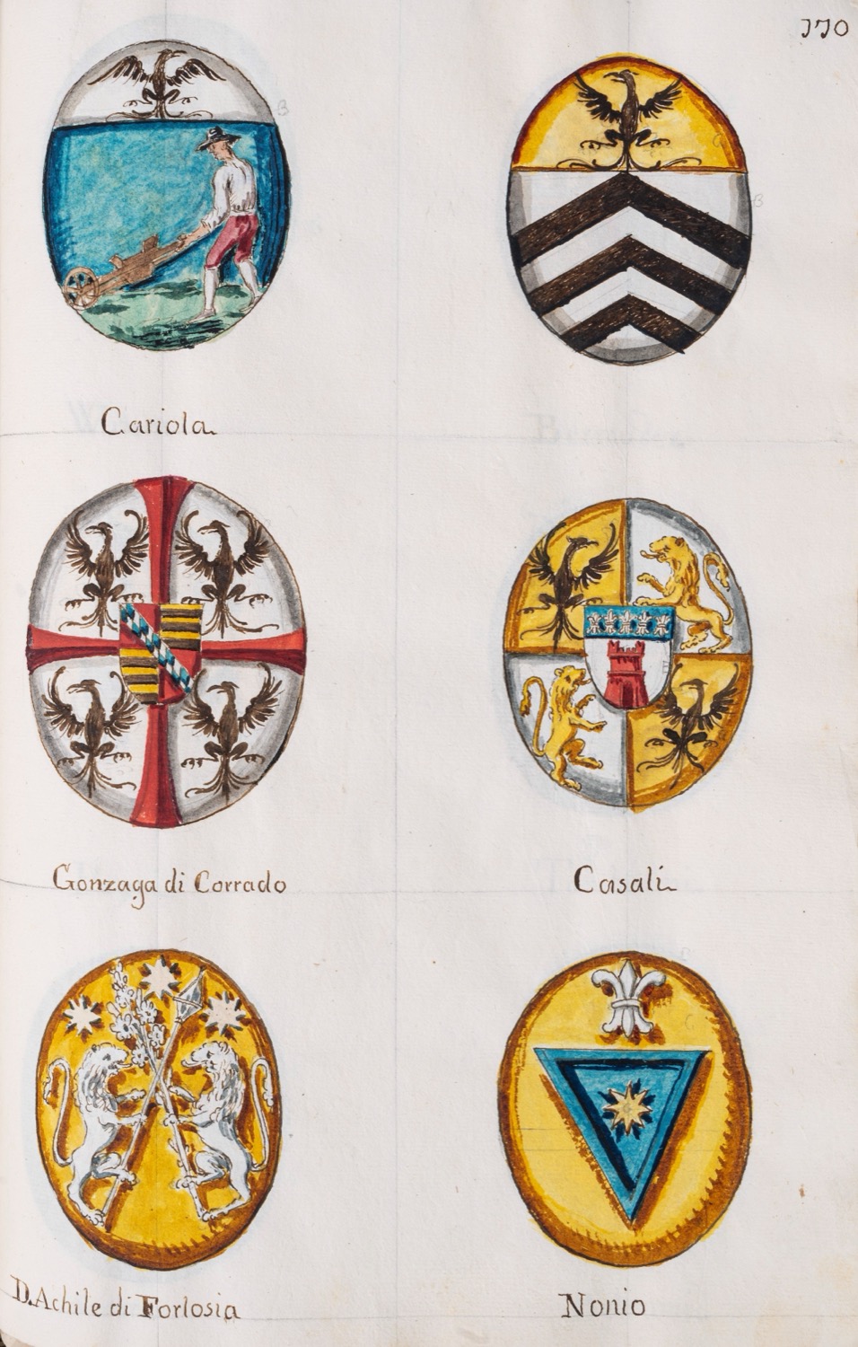Corposo manoscritto cartaceo di natura composita ma principalmente costruito attorno ad una ricchissima raccolta di armi e di stemmi araldici riferibili a famiglie mantovane e non, quasi 300 carte, 325 x 230 mm., diversi mani che vanno dalla fine del sec.XVII sino alla metà del sec.XVIII. Nelle carte iniziali una dedica epigrafica segnala l'occasione del dono di tale manoscritto: le nozze tra Odoardo II Farnese e Dorotea Sofia di Neuburg, avvenute il 17 maggio 1690. Segue l'elenco con relativi stemmi dei quartieri e delle contrade di Mantova, finemente acquarellati. Un dettagliato elenco di famiglie mantovane su 12 carte precede l'Armoriale vero e proprio, che si apre con la descrizione del grande stemma dipinto celebrante il matrimonio (e dunque la fusione delle famiglie) tra Ludovico Gonzaga (noto anche come Luigi IV -Mantova, 18 settembre 1539 – Nesle, 23 ottobre 1595) ed  Enrichetta di Cléves, erede della casata di Nevers e Rethel, che sposò il 4 marzo 1565. Seguono 221 carte con 6 stemmi a pagina finemente acquarellati relativi a famiglie mantovane e non solo. Dall carta numerate 222 sino alla 227 gli stemmi sono presenti ma non colorati, e si riferiscono a famiglie nobili della fine del Seicento. Alcune carte bianche o preparate per ospitare altre Armi precedono una bel disegno dello stemma gentilizio degli Ezelini di Padova. Si apre poi una sezione più strettamente genealogica, con la Geneaologia Totius Familiae Gonzagae sviluppata su 13 carte, cui seguono altre 13 carte con genealogie, disposte su fogli ripiegati. L'ultima parte si configura come un interessantissima descrizione di luoghi mantovani, dal Tè ai vari laghi, con un elenco dei "Luoghi notabili della città di Mantova", seguiti da due raffinati disegni, il primo acquarellato, raffiguranti la pianta di S. Giacomo a Po' e una veduta dettagliata della città di Mantova. Per finire, un lungo elenco di 36 pagine colloca le varie famiglie mantovane all'interno della città, descrivendone abitazione, possedimenti, territori etc. Il volume si conclude con 8 pagine descriventi le "Virtù delle Erbe che sono dipinte nella stanza", ma non è chiaro a quale stanza si riferisca. Un fascicolo volante di sei carte, collocato in fine volume, raccoglie un primo indice delle casate con riferimenti alle diverse carte del manoscritto. Un utile strumento, senza dubbio.