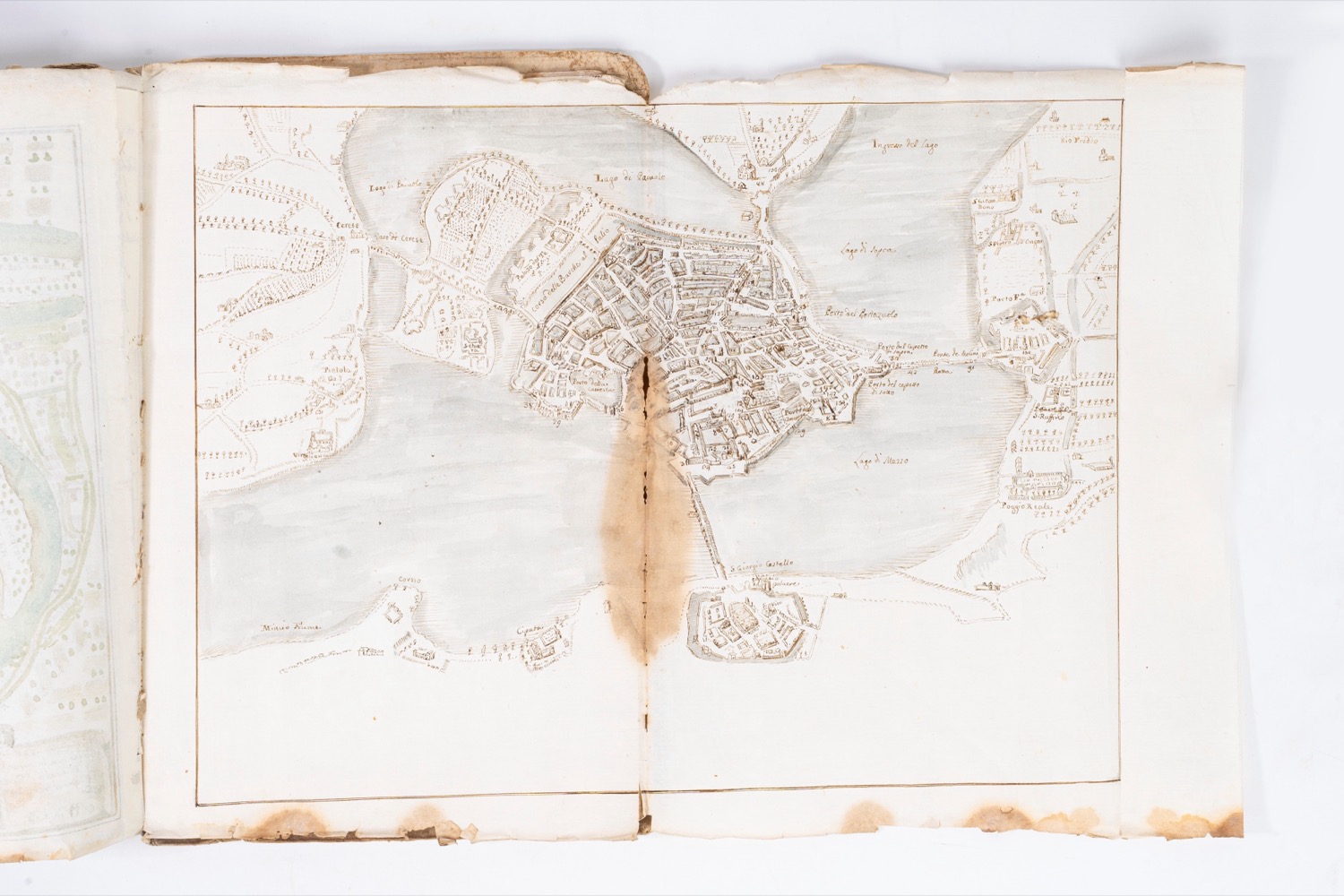 Il volume presenta una coperta in cartoncino rustico con strappi e mancanze, databile intorno alla fine del sec.XVII.Corposo manoscritto cartaceo di natura composita ma principalmente costruito attorno ad una ricchissima raccolta di armi e di stemmi araldici riferibili a famiglie mantovane e non, quasi 300 carte, 325 x 230 mm., diversi mani che vanno dalla fine del sec.XVII sino alla metà del sec.XVIII. Nelle carte iniziali una dedica epigrafica segnala l'occasione del dono di tale manoscritto: le nozze tra Odoardo II Farnese e Dorotea Sofia di Neuburg, avvenute il 17 maggio 1690. Segue l'elenco con relativi stemmi dei quartieri e delle contrade di Mantova, finemente acquarellati. Un dettagliato elenco di famiglie mantovane su 12 carte precede l'Armoriale vero e proprio, che si apre con la descrizione del grande stemma dipinto celebrante il matrimonio (e dunque la fusione delle famiglie) tra Ludovico Gonzaga (noto anche come Luigi IV -Mantova, 18 settembre 1539 – Nesle, 23 ottobre 1595) ed  Enrichetta di Cléves, erede della casata di Nevers e Rethel, che sposò il 4 marzo 1565. Seguono 221 carte con 6 stemmi a pagina finemente acquarellati relativi a famiglie mantovane e non solo. Dall carta numerate 222 sino alla 227 gli stemmi sono presenti ma non colorati, e si riferiscono a famiglie nobili della fine del Seicento. Alcune carte bianche o preparate per ospitare altre Armi precedono una bel disegno dello stemma gentilizio degli Ezelini di Padova. Si apre poi una sezione più strettamente genealogica, con la Geneaologia Totius Familiae Gonzagae sviluppata su 13 carte, cui seguono altre 13 carte con genealogie, disposte su fogli ripiegati. L'ultima parte si configura come un interessantissima descrizione di luoghi mantovani, dal Tè ai vari laghi, con un elenco dei "Luoghi notabili della città di Mantova", seguiti da due raffinati disegni, il primo acquarellato, raffiguranti la pianta di S. Giacomo a Po' e una veduta dettagliata della città di Mantova. Per finire, un lungo elenco di 36 pagine colloca le varie famiglie mantovane all'interno della città, descrivendone abitazione, possedimenti, territori etc. Il volume si conclude con 8 pagine descriventi le "Virtù delle Erbe che sono dipinte nella stanza", ma non è chiaro a quale stanza si riferisca. Un fascicolo volante di sei carte, collocato in fine volume, raccoglie un primo indice delle casate con riferimenti alle diverse carte del manoscritto. Un utile strumento, senza dubbio.