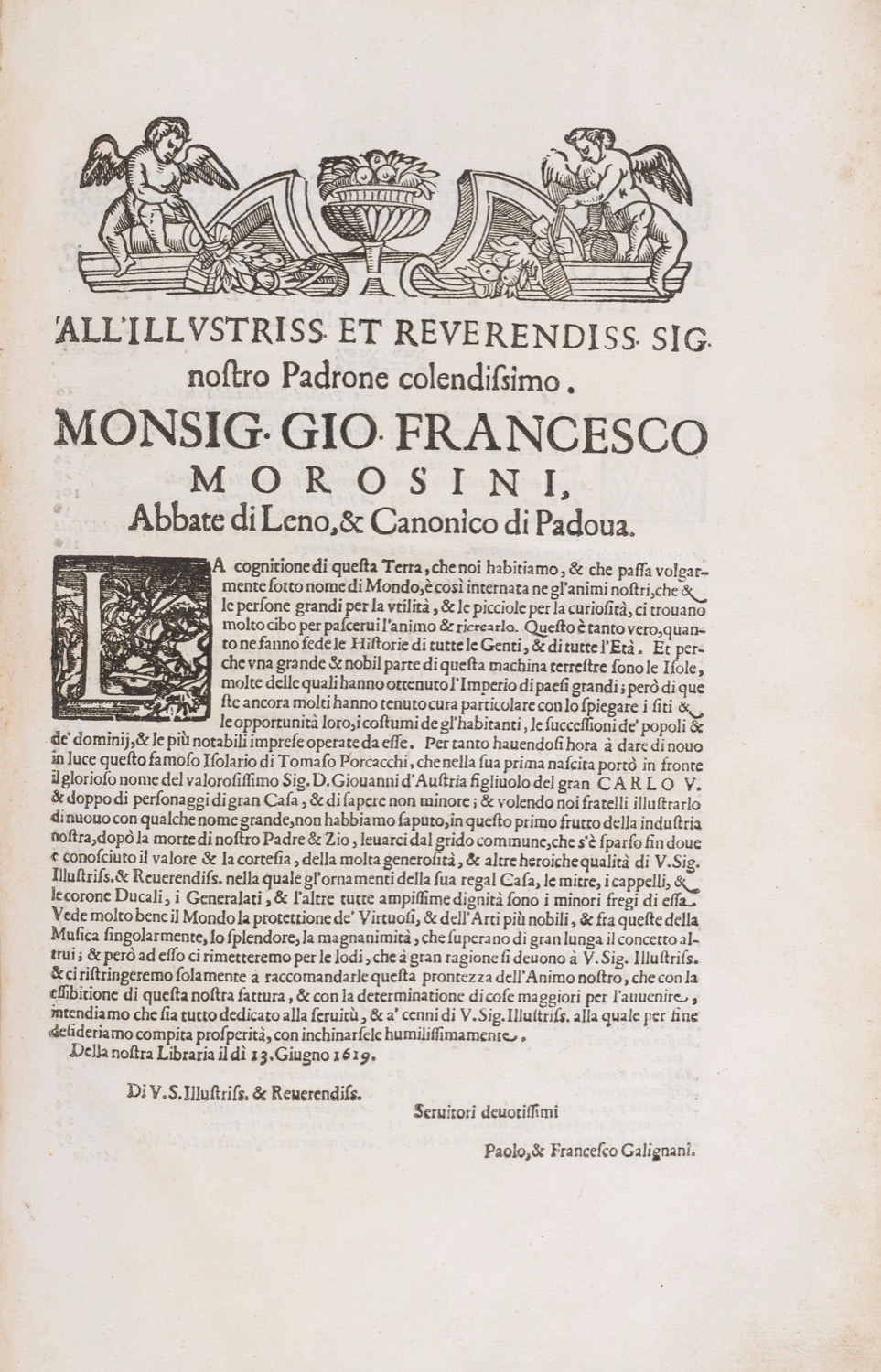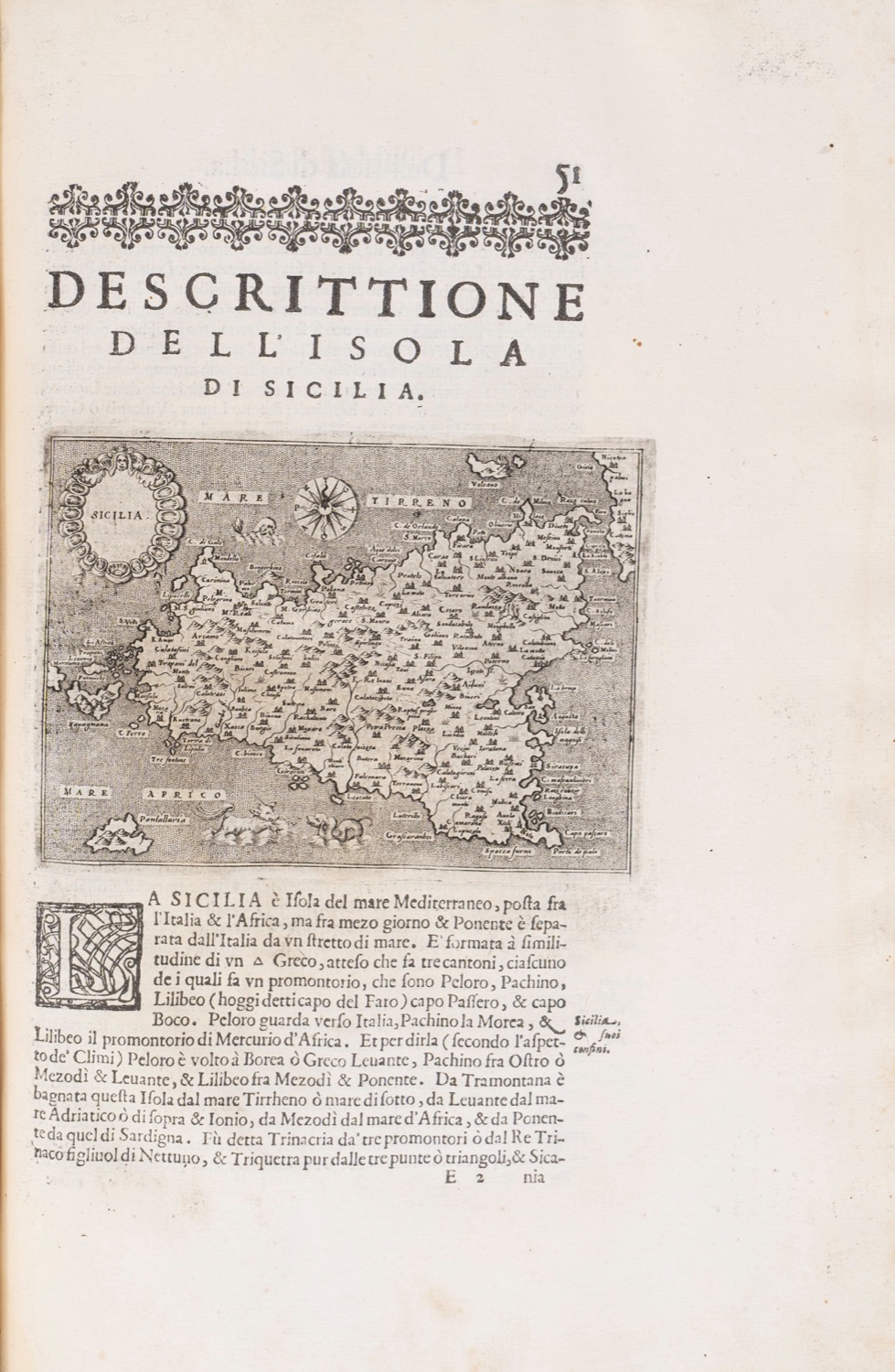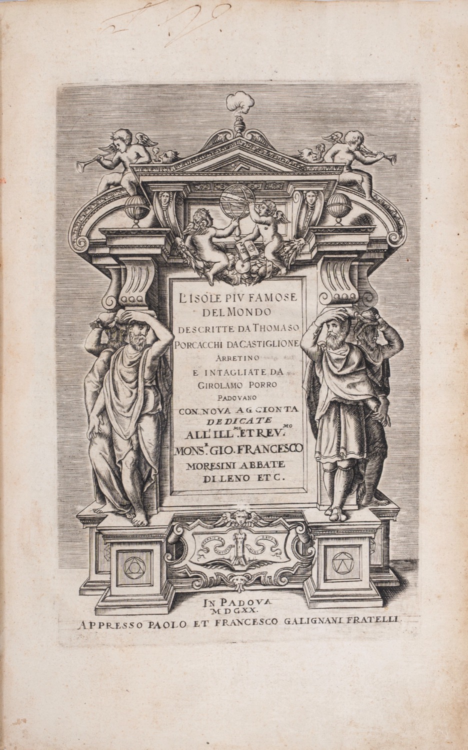 Padova, appresso Paolo e Francesco Galignani fratelli, 1620. In 2°. Legatura in cartoncino marmorizzato, dorso in cuoio, p. (24), 211, (1). Frontespizio calcografico e 48 splendide raffigurazioni geografiche incise in rame da Girolamo Porro, con le isole, le penisole e le città insulari da tutto il globo, incluse alcune isole dell'Asia e del "Nuovo Mondo" delle Americhe. Edizione padovana con aggiunte rispetto alle precedenti pubblicate a Venezia. Testatine e capolettera xilografici. Esemplare con timbro della Libreria Umberto Saba. Esemplare in ottimo stato di conservazione.Padova, appresso Paolo e Francesco Galignani fratelli, 1620. In 2°. Legatura in cartoncino marmorizzato, dorso in cuoio, p. (24), 211, (1). Frontespizio calcografico e 48 splendide raffigurazioni geografiche incise in rame da Girolamo Porro, con le isole, le penisole e le città insulari da tutto il globo, incluse alcune isole dell'Asia e del "Nuovo Mondo" delle Americhe. Edizione padovana con aggiunte rispetto alle precedenti pubblicate a Venezia. Testatine e capolettera xilografici. Esemplare con timbro della Libreria Umberto Saba. Esemplare in ottimo stato di conservazione.