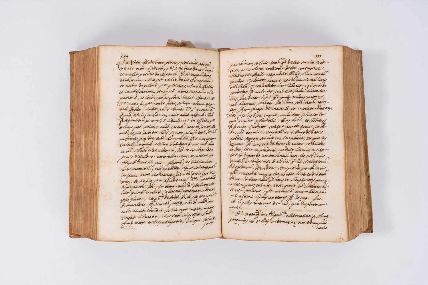 Roma, Typis Mascardi, 1641. In 8°. Legatura in piena pergamena con titolo scritto a mano al dorso. Frontespizio con cornice riccamente decorata con il titolo manoscritto. Il libro non è firmato, ma proviene dagli eredi della famiglia Romanelli. Possibilmente può essere attribuito a Pietro Angelo Romanelli, dato che la scrittura del testo e la legatura del libro sono analoghi ai suoi. Un voluminoso manoscritto su questioni giuridiche, è una copia di studio. Timbro e lievi segni del tempo.Roma, Typis Mascardi, 1641. In 8°. Legatura in piena pergamena con titolo scritto a mano al dorso. Frontespizio con cornice riccamente decorata con il titolo manoscritto. Il libro non è firmato, ma proviene dagli eredi della famiglia Romanelli. Possibilmente può essere attribuito a Pietro Angelo Romanelli, dato che la scrittura del testo e la legatura del libro sono analoghi ai suoi. Un voluminoso manoscritto su questioni giuridiche, è una copia di studio. Timbro e lievi segni del tempo.