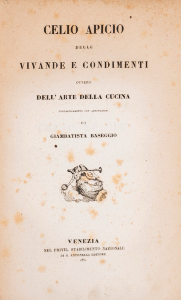 Volgarizzato con annotazioni di Giambattista Baseggio. Venezia, Antonelli, 1852. 8° gr. Legatura mz. pelle con angoli, cordoni, titolo e fregi in oro al dorso. Qualche rara brunitura, ma ottime condizioni per questa rara prima traduzione italiana di Apicio, che, come spiega il Baseggio nella sua introduzione, è “Una compilazione fatta da più libri di cucina” passata poi alla storia come opera “del più celebre fra i ghiottoni” del tempo di Tiberio. Fatto sta che il De Re Coquinaria viene considerato il capostipite dei libri di gastronomia.