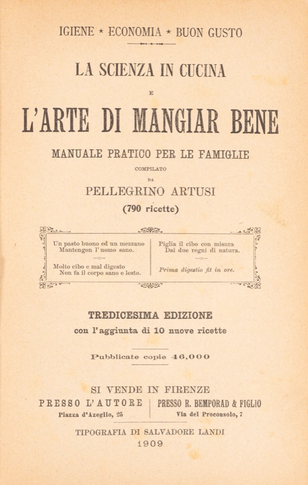 Pellegrino Artusi - La scienza in cucina e l'arte di mangiar bene. Manuale pratico per le famiglie., 1909