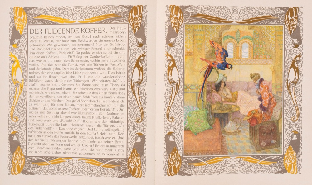 Vienna, Munk, 1911. In 4°. Brossura rigida originale color crema. 12 illustrazioni a piena pagina in stile Jugendstil a colori realizzate da Heinrich Lefler e Josef Urban. Ogni tavola è circondata da ampi bordi decorativi raffiguranti fiori, animali, stemmi e altri motivi legati all'immagine — arricchiti con colori grigio platino e dorature. Ogni bordo è di disegno diverso. La copertina anteriore e la pagina del titolo sono anch’esse decorate in oro, quest’ultima una cromolitografia impreziosita con dettagli dorati. Testo in tedesco. Esemplare in ottimo stato di conservazione.Vienna, Munk, 1911. In 4°. Brossura rigida originale color crema. 12 illustrazioni a piena pagina in stile Jugendstil a colori realizzate da Heinrich Lefler e Josef Urban. Ogni tavola è circondata da ampi bordi decorativi raffiguranti fiori, animali, stemmi e altri motivi legati all'immagine — arricchiti con colori grigio platino e dorature. Ogni bordo è di disegno diverso. La copertina anteriore e la pagina del titolo sono anch’esse decorate in oro, quest’ultima una cromolitografia impreziosita con dettagli dorati. Testo in tedesco. Esemplare in ottimo stato di conservazione.