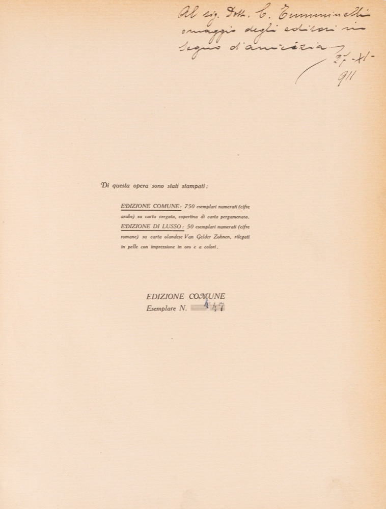 Milano, Alfieri e Lacroix Editori, 1911. In 8° grande. Copertina rigida in cartonato rivestito da carta pergamena. Esemplare su carta vergata e copertina in carta pergamena n. 447 di una tiratura limitata di 800 volumi. Dedica manoscritta degli editori. Presente ritratto dell'autore su foglio semimobile alla carta antecedente la IX. Edizione riccamente illustrata. Leggero ingiallimento delle pagine. Legatura allentata. Milano, Alfieri e Lacroix Editori, 1911. In 8° grande. Copertina rigida in cartonato rivestito da carta pergamena. Esemplare su carta vergata e copertina in carta pergamena n. 447 di una tiratura limitata di 800 volumi. Dedica manoscritta degli editori. Presente ritratto dell'autore su foglio semimobile alla carta antecedente la IX. Edizione riccamente illustrata. Leggero ingiallimento delle pagine. Legatura allentata.