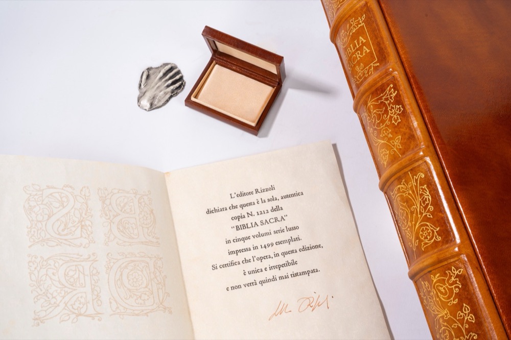 Il lotto comprende: certificato di provenienza e autenticità e piccolo fermacarte a forma di mano in argento sbalzato, firmato in basso a sinistra da Dalì, conservato entro astuccio in pelle nocciola. 5 volumi in-folio con, complessivamente, belle tavole fuori testo dagli acquerelli di Salvador Dalì. Le tavole, impresse con tecnica mista serigrafica e litografica a colori, sono protette da veline didascaliche in carta Japon. Bella legatura in piena pelle color cuoio, riccamente decorata con fregi fitomorfi e titoli impressi in oro al dorso a 5 nervi. Tagli superiori dorati e sguardie in moirè di seta avorio. Entro eleganti custodie in mezza pelle, con piatti e dorso in moirè di seta avorio, ben conservate. Copia n. 1212 edita da Rizzoli, di una tiratura complessiva di 1499 esemplari.
