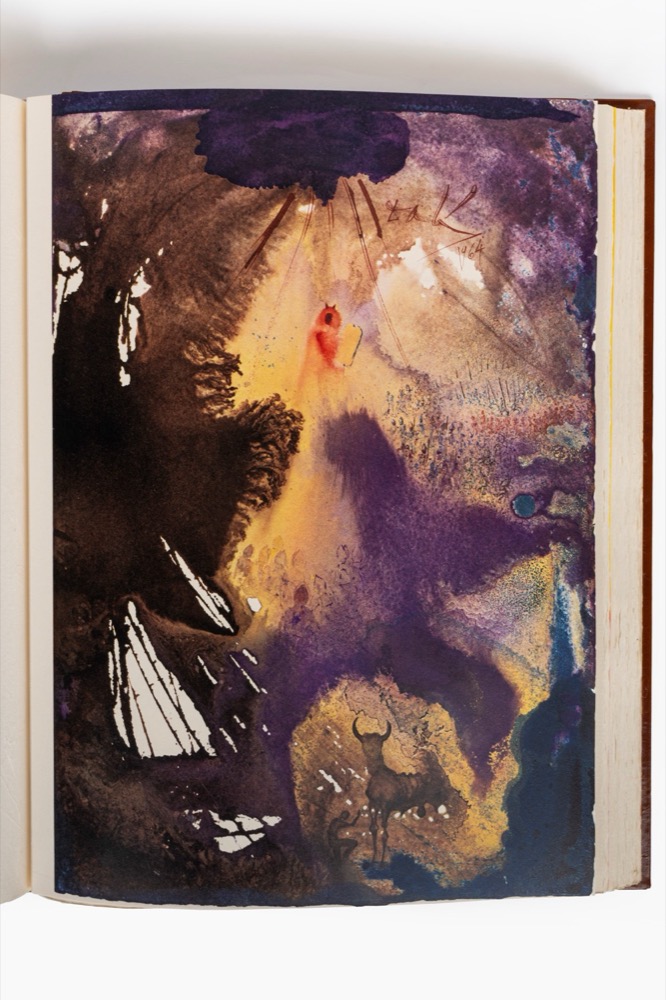 5 volumi in-folio con, complessivamente, belle tavole fuori testo dagli acquerelli di Salvador Dalì. Le tavole, impresse con tecnica mista serigrafica e litografica a colori, sono protette da veline didascaliche in carta Japon. Bella legatura in piena pelle color cuoio, riccamente decorata con fregi fitomorfi e titoli impressi in oro al dorso a 5 nervi. Tagli superiori dorati e sguardie in moirè di seta avorio. Entro eleganti custodie in mezza pelle, con piatti e dorso in moirè di seta avorio, ben conservate. Copia n. 1212 edita da Rizzoli, di una tiratura complessiva di 1499 esemplari.