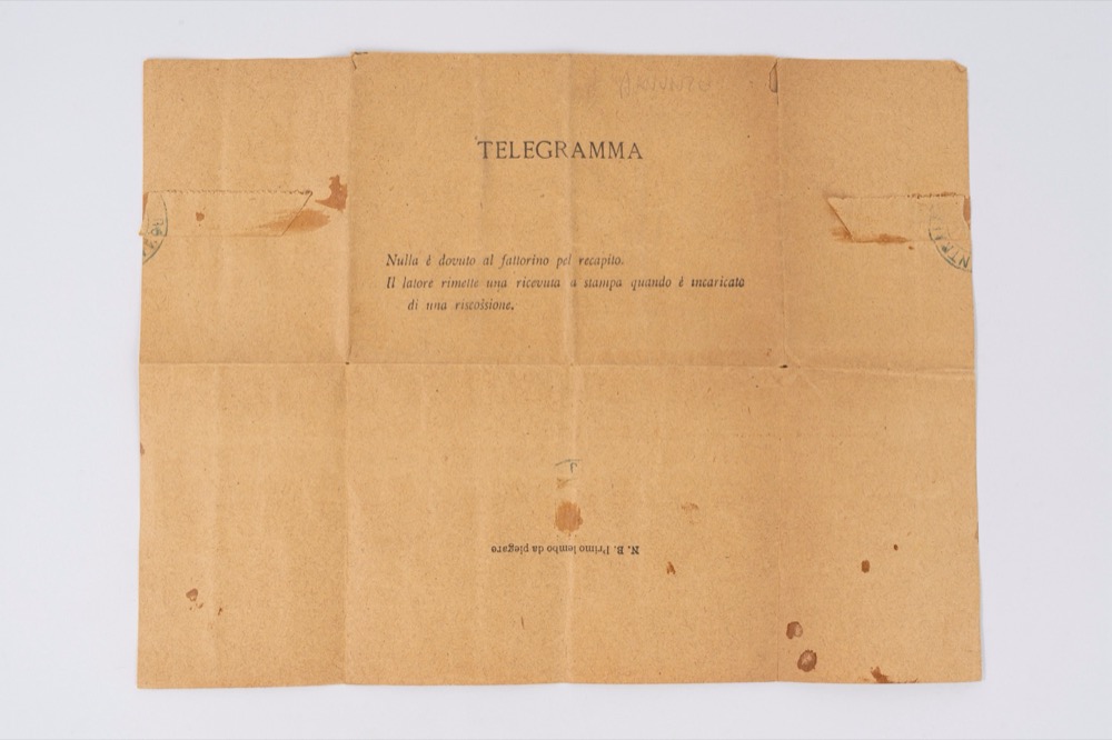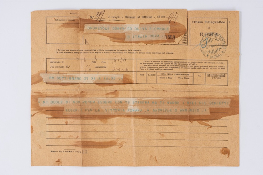Telegramma con protezione acetata trasparente su supporto cartonato. Il destinatario è Domenico Oliva, Giornale d'Italia, mentre il mittente è Gabriele d'Annunzio. Il testo del telegramma: "Mi duole di non potere essere con te stasera ma ti mando i miei piu schietti auguri per la vittoria romana + Gabriele D'Annunzio +". Il telegramma è stato spedito da Roma a Settignano. Il documento è corredato di timbro e note manoscritte. Leggere bruniture. Telegramma con protezione acetata trasparente su supporto cartonato. Il destinatario è Domenico Oliva, Giornale d'Italia, mentre il mittente è Gabriele d'Annunzio. Il testo del telegramma: "Mi duole di non potere essere con te stasera ma ti mando i miei piu schietti auguri per la vittoria romana + Gabriele D'Annunzio +". Il telegramma è stato spedito da Roma a Settignano. Il documento è corredato di timbro e note manoscritte. Leggere bruniture.