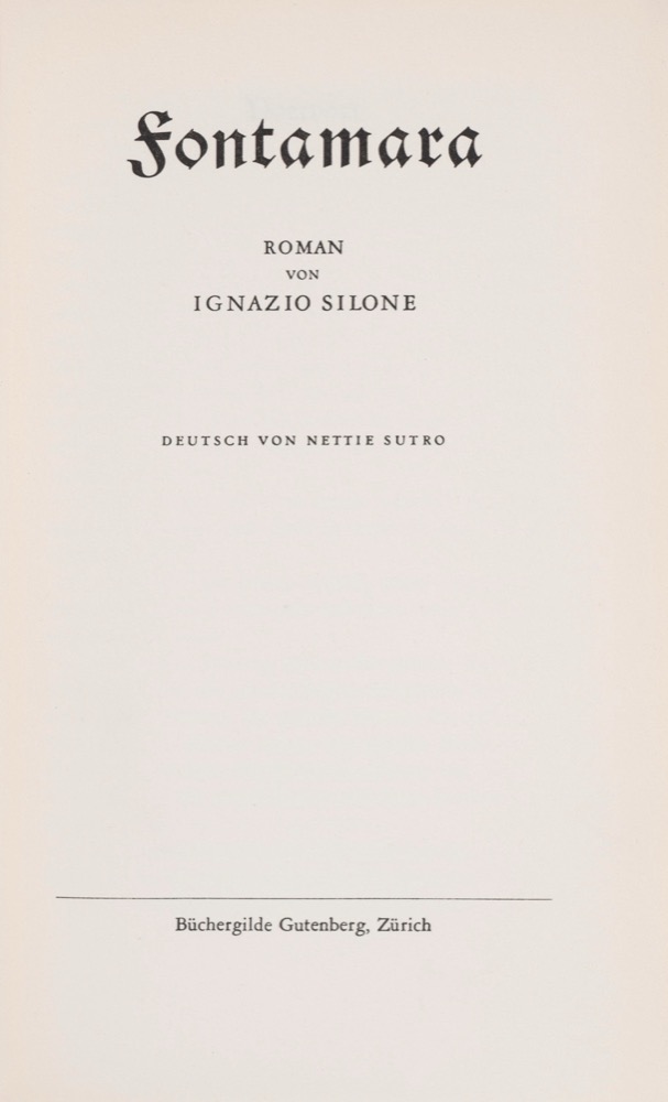 Ignazio Silone, Fontamara: Zurigo, Büchergilde Gutenberg, 1933. In 8°. Prima edizione illustrata e testo in tedesco. Legatura in piena tela editoriale grisaglia a grana grossa, stampata in nero al piatto anteriore e in rosso al dorso (titoli in carattere stile scrittura gotica). Timbro. Esemplare in barbe, a cui manca la sovracoperta editoriale.