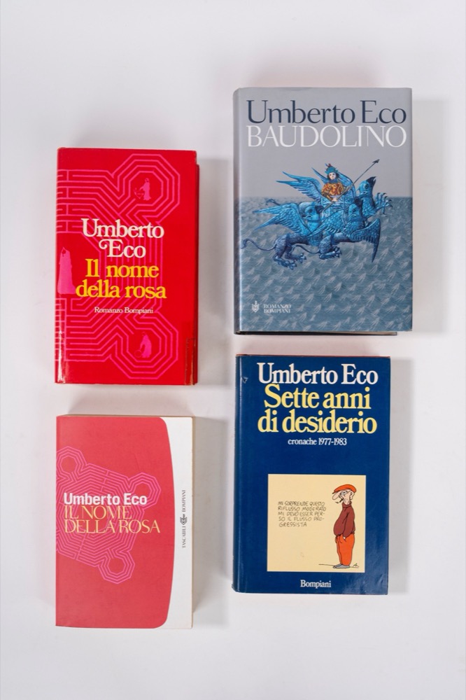 A chiudere il lotto la prima edizione del 2000 di Baudolino, casa editrice Bompiani. Tela editoriale con sovraccoperta;