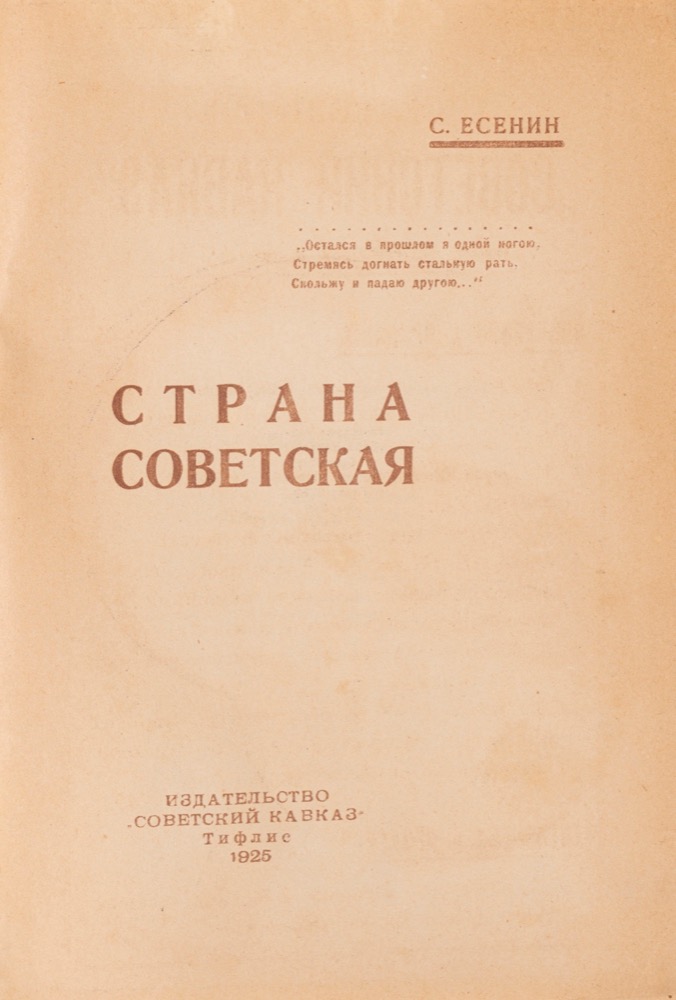 Ultima edizione pubblicata in vita da Esenin nel Caucaso, dove il poeta trascorse molto tempo tra il 1924 e il 1925, scegliendo questa regione come rifugio durante un periodo difficile della sua vita. Le poesie liriche sono permeate da un profondo amore per la nuova Russia Rivoluzionaria, il cui destino è inseparabile da quello dello stesso Esenin, e riflettono il senso di responsabilità del poeta verso il proprio popolo, il proprio tempo e la propria patria. Durante la sua breve vita, Sergej Esenin (1895–1925) ottenne riconoscimento come il miglior poeta lirico della Russia.Tbilisi, Sovetskiy Kavkaz, 1925. In 8°. Esemplare in brossura editoriale. Copertina progettata da Zdanevich. Tiratura limitata di 5000 copie. Lievi bruniture. Alcuni fogli sono leggermente allentati.