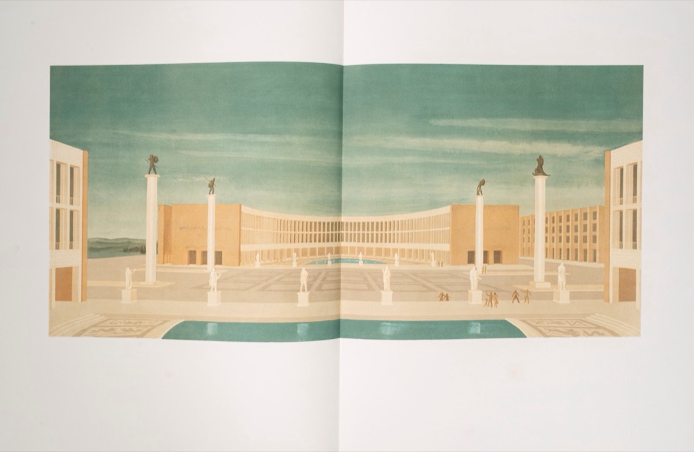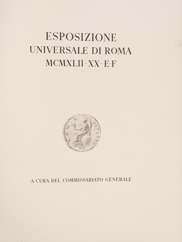 Si tratta dell’edizione di lusso di quest’opera celebrativa dell’Esposizione Universale del 1942 che non vide mai la luce, ma che è all’origine dell’attuale quartiere romano dell’EUR. Prevista in una tiratura di 1200 copie, lo scoppio della guerra ne fece sospendere la stampa e l’invio alle autorità a cui era destinata, rendendo l’opera molto più rara di quanto il numero di copie indicate nel colophon non suggerirebbe.