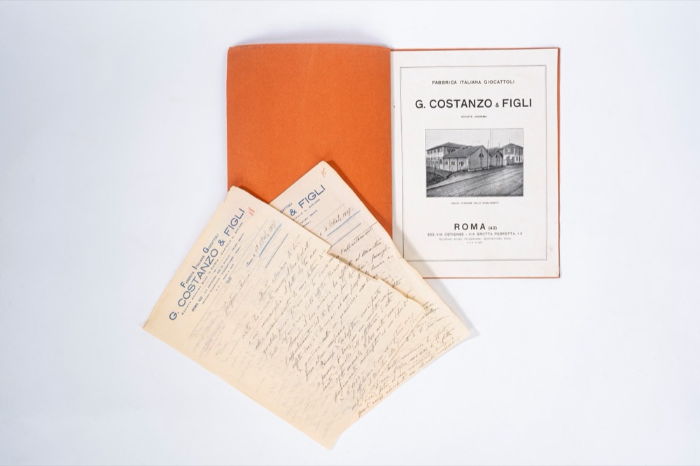 Roma, Casa Editrice d'Arte Bestetti e Tumminelli S.A., 1927. In 8° grande. Catalogo di giocattoli illustrato della Fabbrica Italiana Giocattoli G. Costanzo & Figli. Al suo interno sono conservate due lettere manoscritte in due fogli sciolti su carta intestata della fabbrica, datate al 4 e 12 ottobre 1927. Brossura editoriale, legata al margine sinistro da un laccio.Roma, Casa Editrice d'Arte Bestetti e Tumminelli S.A., 1927. In 8° grande. Catalogo di giocattoli illustrato della Fabbrica Italiana Giocattoli G. Costanzo & Figli. Al suo interno sono conservate due lettere manoscritte in due fogli sciolti su carta intestata della fabbrica, datate al 4 e 12 ottobre 1927. Brossura editoriale, legata al margine sinistro da un laccio.