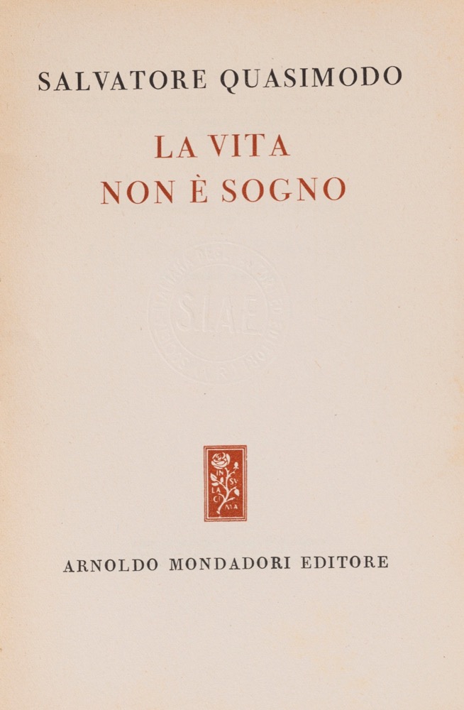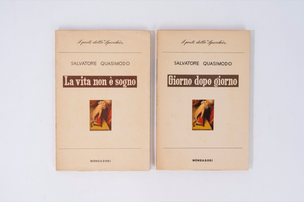 La vita non è un sogno, Prima edizione del 1949, casa editrice Mondadori. Brossura editoriale, Collana Lo Specchio. Ottava opera del futuro premio Nobel. Segue nel lotto: Giorno dopo giorno, Seconda edizione del 1949, casa editrice Mondadori. Brossura editoriale. Collana Lo Specchio, con introduzione di Carlo Bo. Settima opera del futuro premio Nobel. Copia impreziosita da firma di possesso dell’eminente critico letterario Giuseppe Susini. I due ebbero un grandissimo rapporto di amicizia coltivato negli anni, come testimoniato dalla bella pubblicazione “I poeti devono soffrire: lettere a Giuseppe Susini (1934-1950)”, edito nel 2003 a cura di Giovanna Musolino per la casa editrice Nicolodi di Rovereto.La vita non è un sogno, Prima edizione del 1949, casa editrice Mondadori. Brossura editoriale, Collana Lo Specchio. Ottava opera del futuro premio Nobel. Segue nel lotto: Giorno dopo giorno, Seconda edizione del 1949, casa editrice Mondadori. Brossura editoriale. Collana Lo Specchio, con introduzione di Carlo Bo. Settima opera del futuro premio Nobel. Copia impreziosita da firma di possesso dell’eminente critico letterario Giuseppe Susini. I due ebbero un grandissimo rapporto di amicizia coltivato negli anni, come testimoniato dalla bella pubblicazione “I poeti devono soffrire: lettere a Giuseppe Susini (1934-1950)”, edito nel 2003 a cura di Giovanna Musolino per la casa editrice Nicolodi di Rovereto.