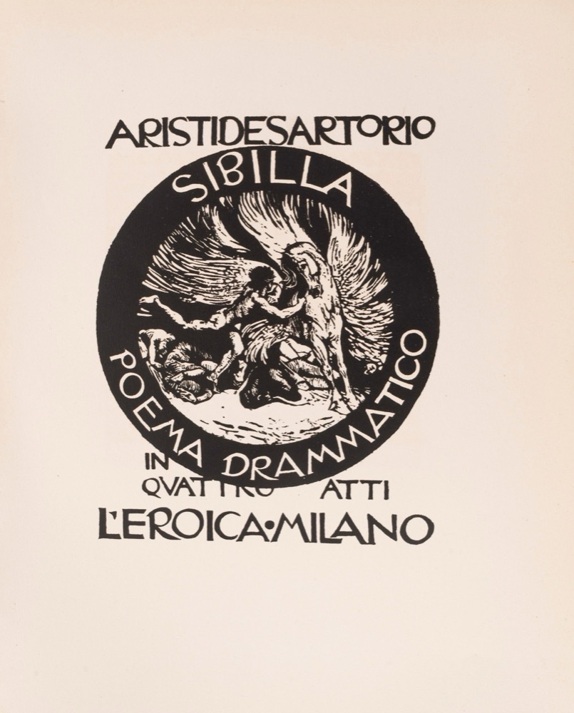 Un'opera d'arte grafica unica che accompagna un poema in quattro atti con proemio. Si tratta di un'opera tragica, in cui si scontrano voluttà e castità, peccato e virtù, spirito del bene e spirito del male e giustizia condannatrice e perdono. Milano, L'Eroica, 1922. In 4°. Legatura in cartonato con piatti illustrati. Esemplare n. 447 di una tiratura limitata di 1333 copie numerate e firmate dall'editore e dall'autore. Edizione illustrata e fregi tipografici incisi dell'autore. L'opera è corredata di una lettera dattiloscritta dall'editore. Esemplare in ottimo stato di conservazione.
