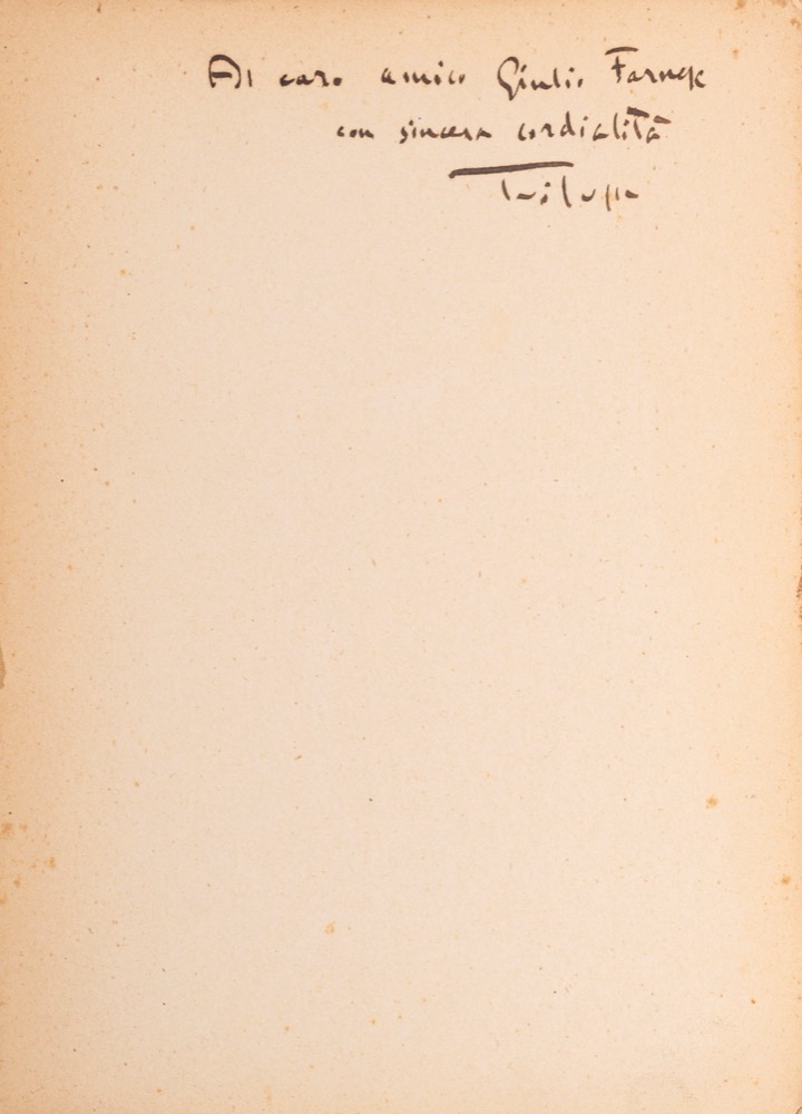 Edito da Mondadori, Milano nel 1930. All'interno dedica autografa dell’autore al pittore romano Giulio Farnese. Bruniture, copertina anteriore staccata. Edito da Mondadori, Milano nel 1930. All'interno dedica autografa dell’autore al pittore romano Giulio Farnese. Bruniture, copertina anteriore staccata.
