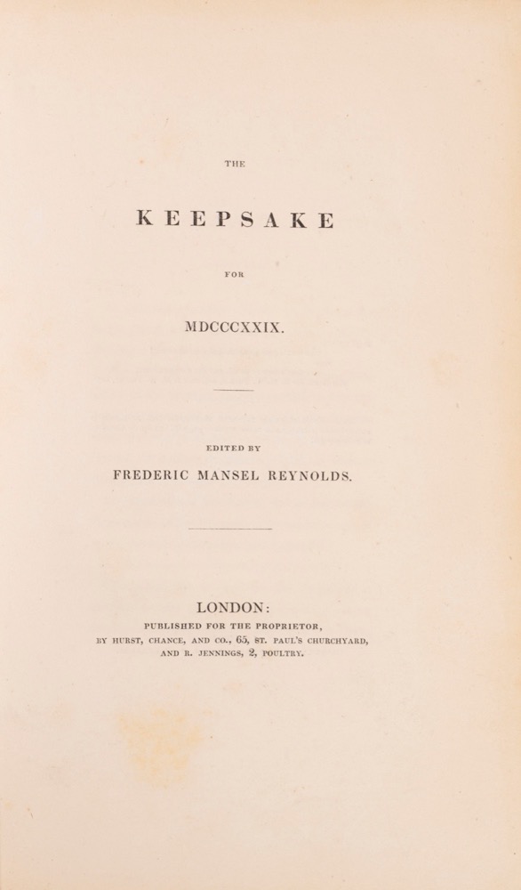 The Keepsake era un giornale letterario inglese, pubblicato tra il 1828 e il 1857 durante il periodo natalizio come libro regalo per giovani donne, noto per la sua copertina in seta rossa e la raffinatezza delle illustrazioni. Frederic Mansel Reynolds fu il curatore delle edizioni 1829-1835 e 1838-1839. Un pezzo decorativo del periodo romantico, raro e da collezione.