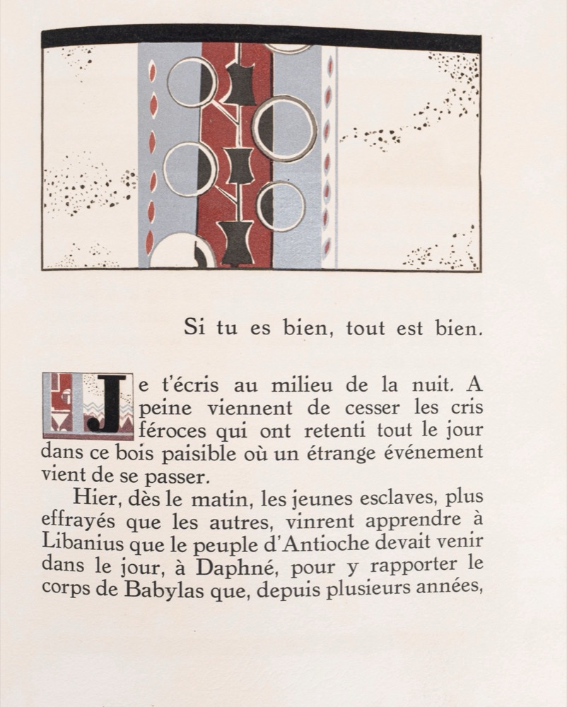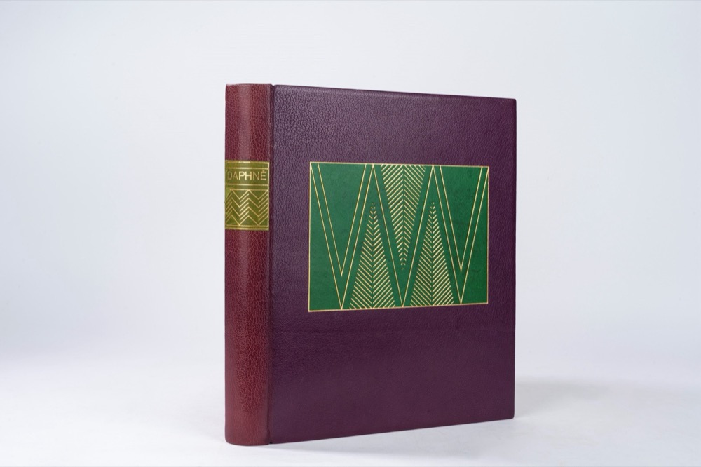 Paris, F.L. Schmied, 1924. In 4°, 300 x 250 mm. 49 incisioni in legno a colori di François-Louis Schmied, composte da frontespizio, testatine e code, grandi lettere iniziali decorative e diverse piccole illustrazioni e 3 illustrazioni a piena pagina. Esemplare n.10 a Charles Walther su una tiratura di 140. Splendida legatura in marocchino viola con al piatto superiore un grande inserto in pelle verde e decorazioni in oro.Paris, F.L. Schmied, 1924. In 4°, 300 x 250 mm. 49 incisioni in legno a colori di François-Louis Schmied, composte da frontespizio, testatine e code, grandi lettere iniziali decorative e diverse piccole illustrazioni e 3 illustrazioni a piena pagina. Esemplare n.10 a Charles Walther su una tiratura di 140. Splendida legatura in marocchino viola con al piatto superiore un grande inserto in pelle verde e decorazioni in oro.