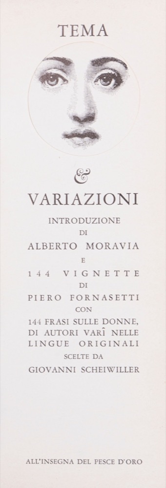 All'insegna del Pesce d'Oro, 1964, volume curato da Pietro Fornasetti e Vanni Scheiwiller, impresso in duemila copie. Introduzione di Alberto Moravia con 144 Vignette di Pietro Fornasetti
