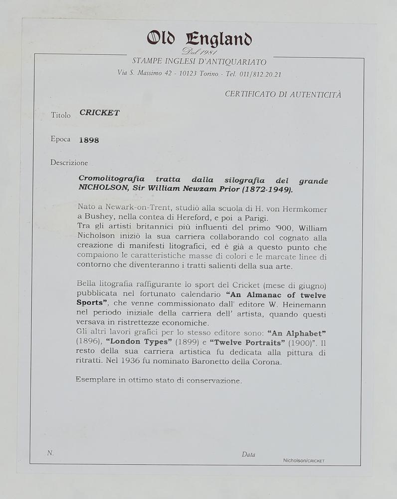 sul retro: certificato di autenticità Old England Gallery, Torino