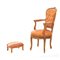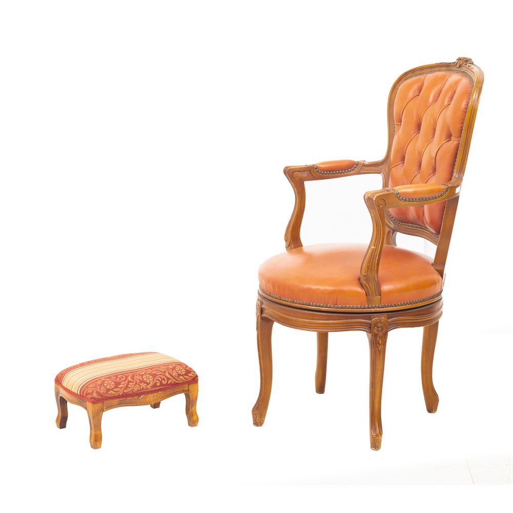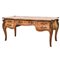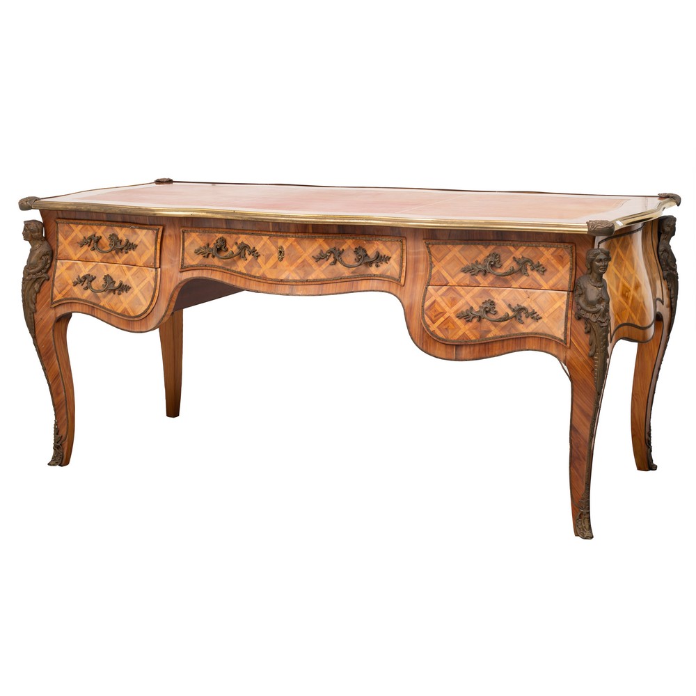 Diplomatica stile Luigi XV in legno di rosa a cinque cassetti, guarnita da bronzi, piano in pelle con poltrona girevole e poggiapiedi.