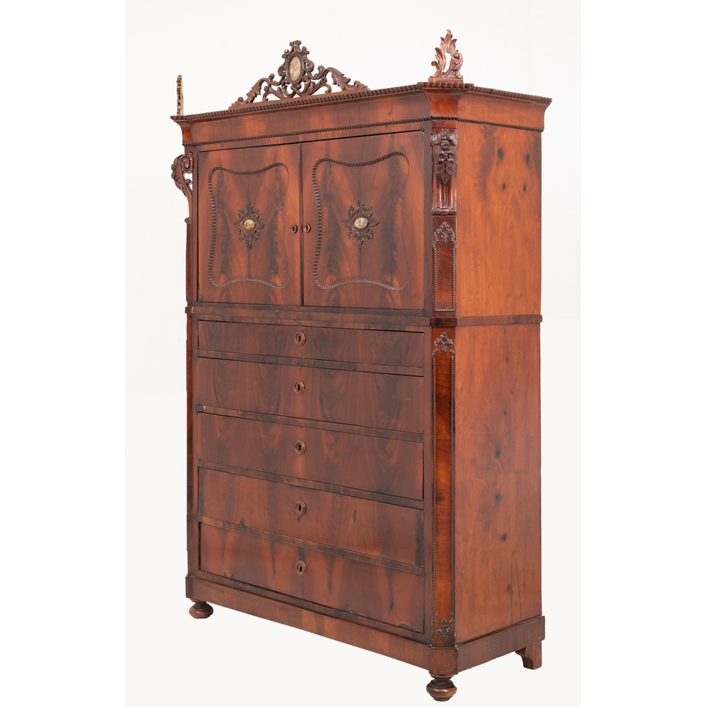 Chiffoniere Luigi Filippo a due ante e cinque cassetti in legno di mogano e piuma di mogano.