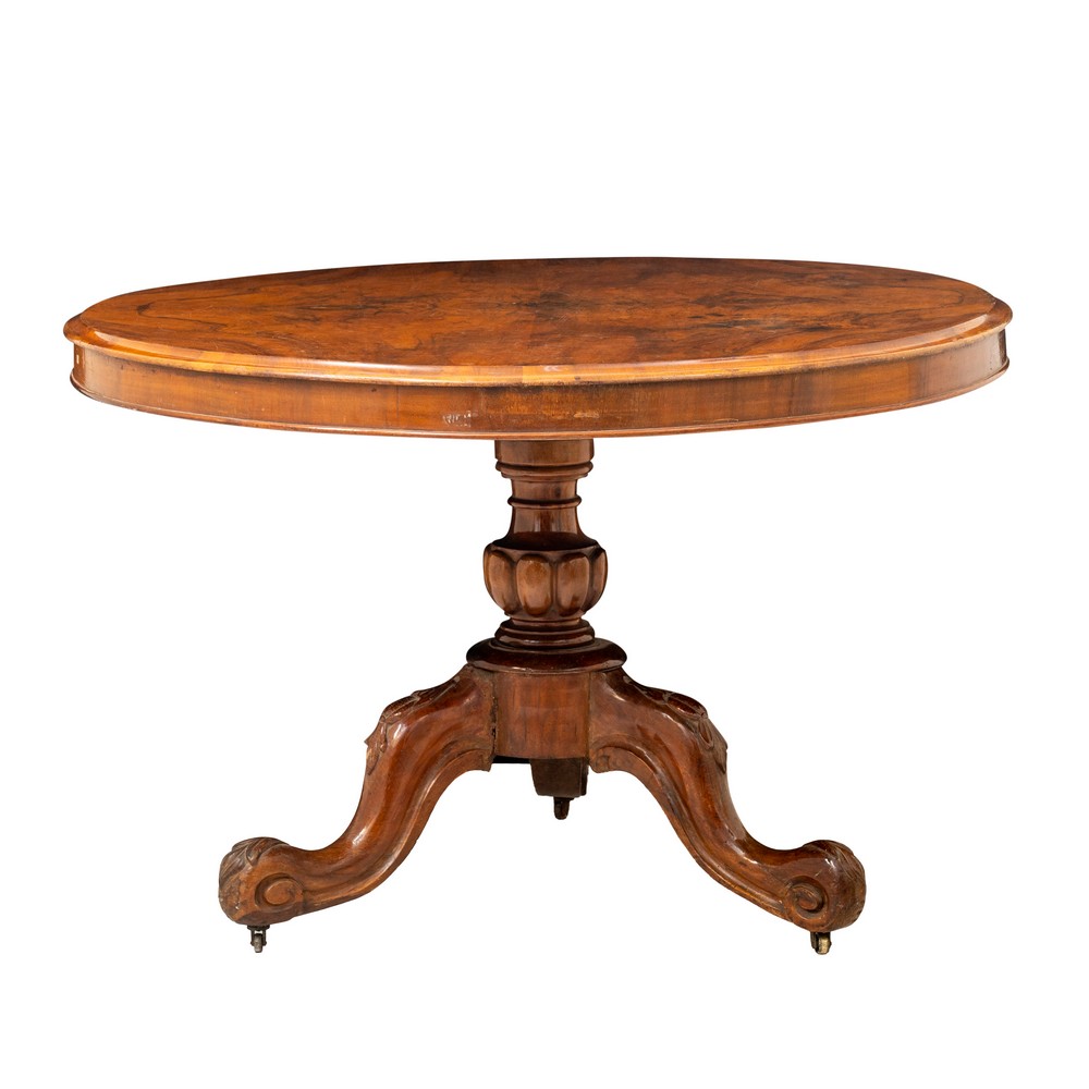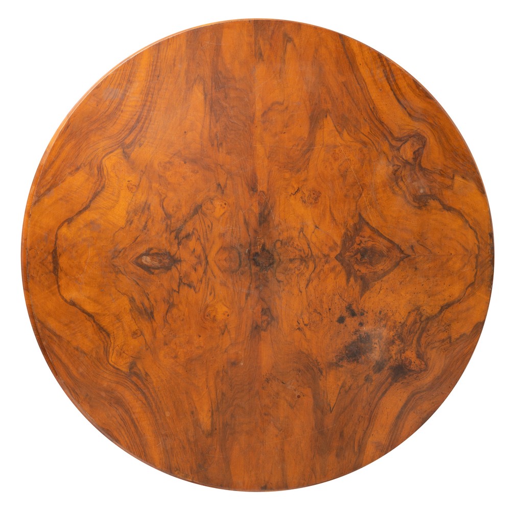 Tavolo a vela di forma circolare in legno di noce e radica di noce.