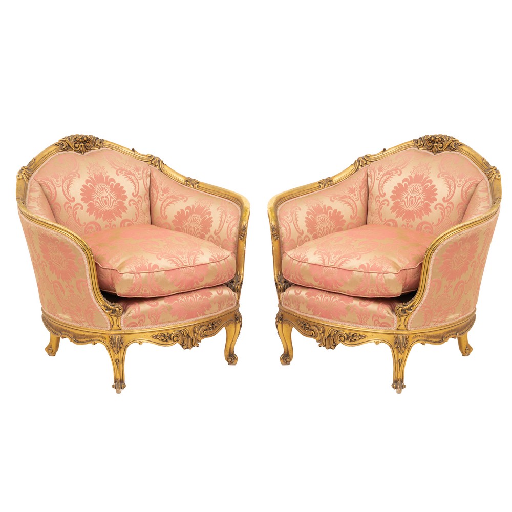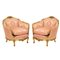 Coppia di poltrone a pozzetto in legno dorato tappezzate con stoffa damascata nei toni del rosa.