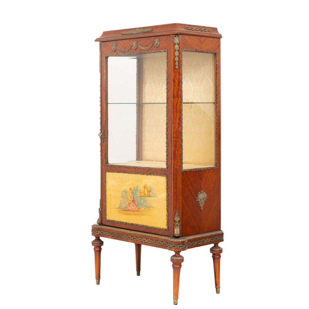 Vetrina di gusto francese ad un'anta in legno di rosa riccamente guarnita da bronzi, frontale dipinto e decorato a mano.
