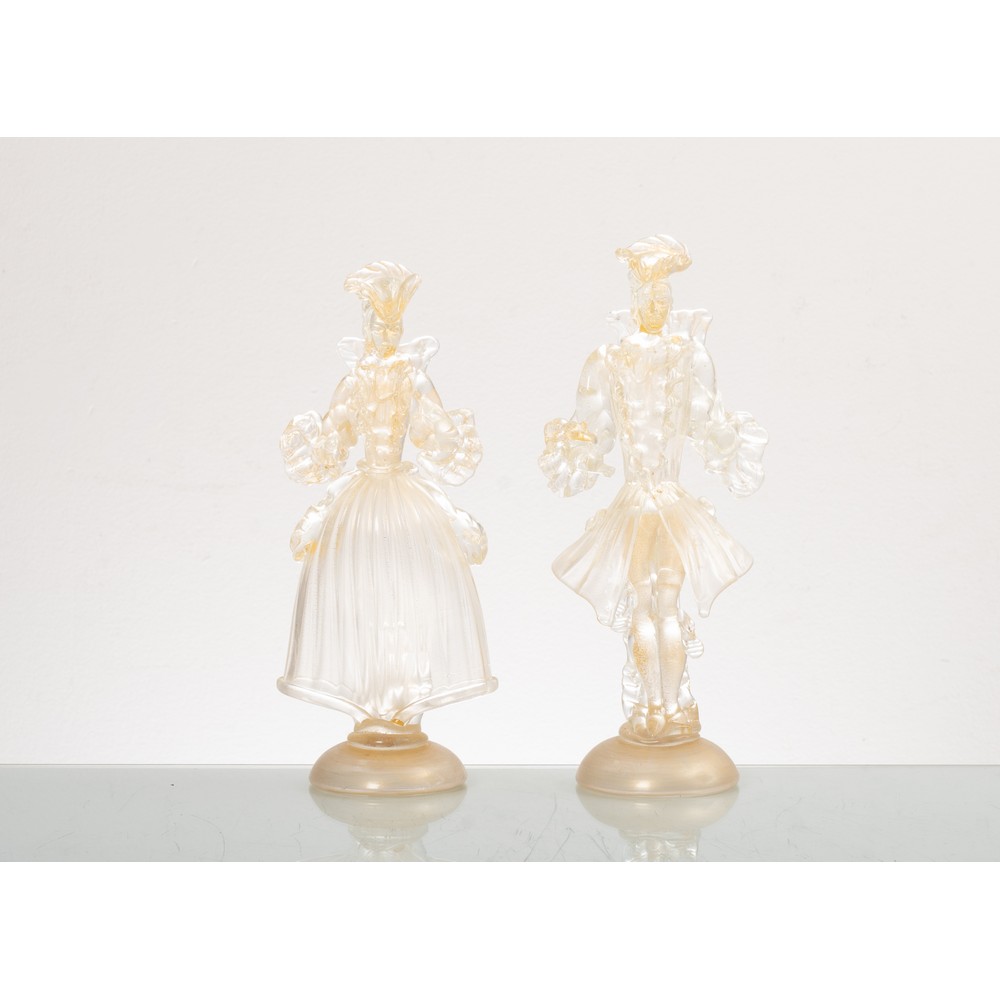 Coppia di sculture in vetro di Murano nei toni del bianco ed oro raffiguranti "Figure".