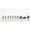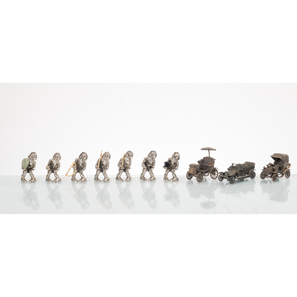 Tre macchinine in metallo argentato e sette piccole sculture in metallo raffiguranti "Personaggi vari".